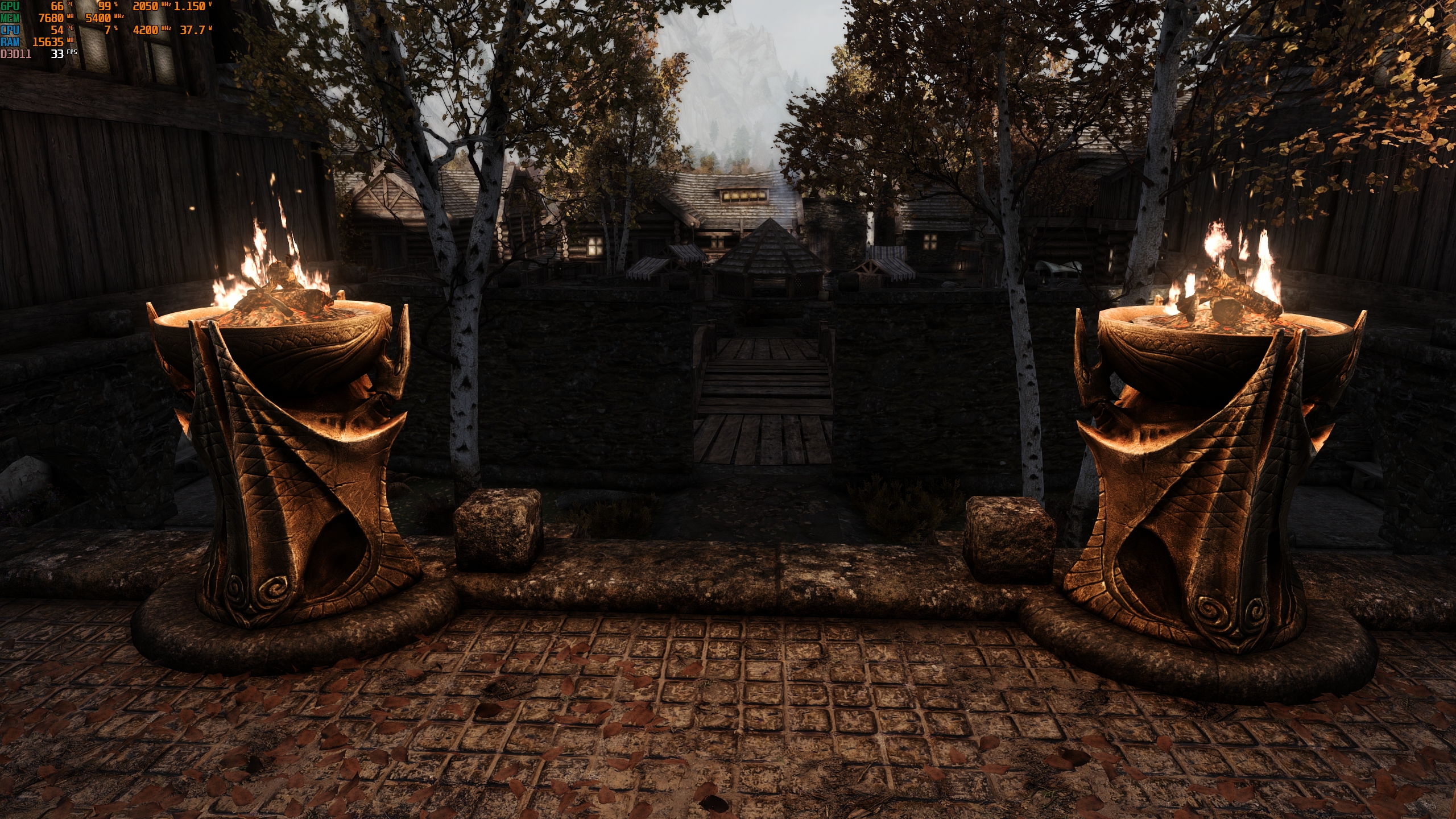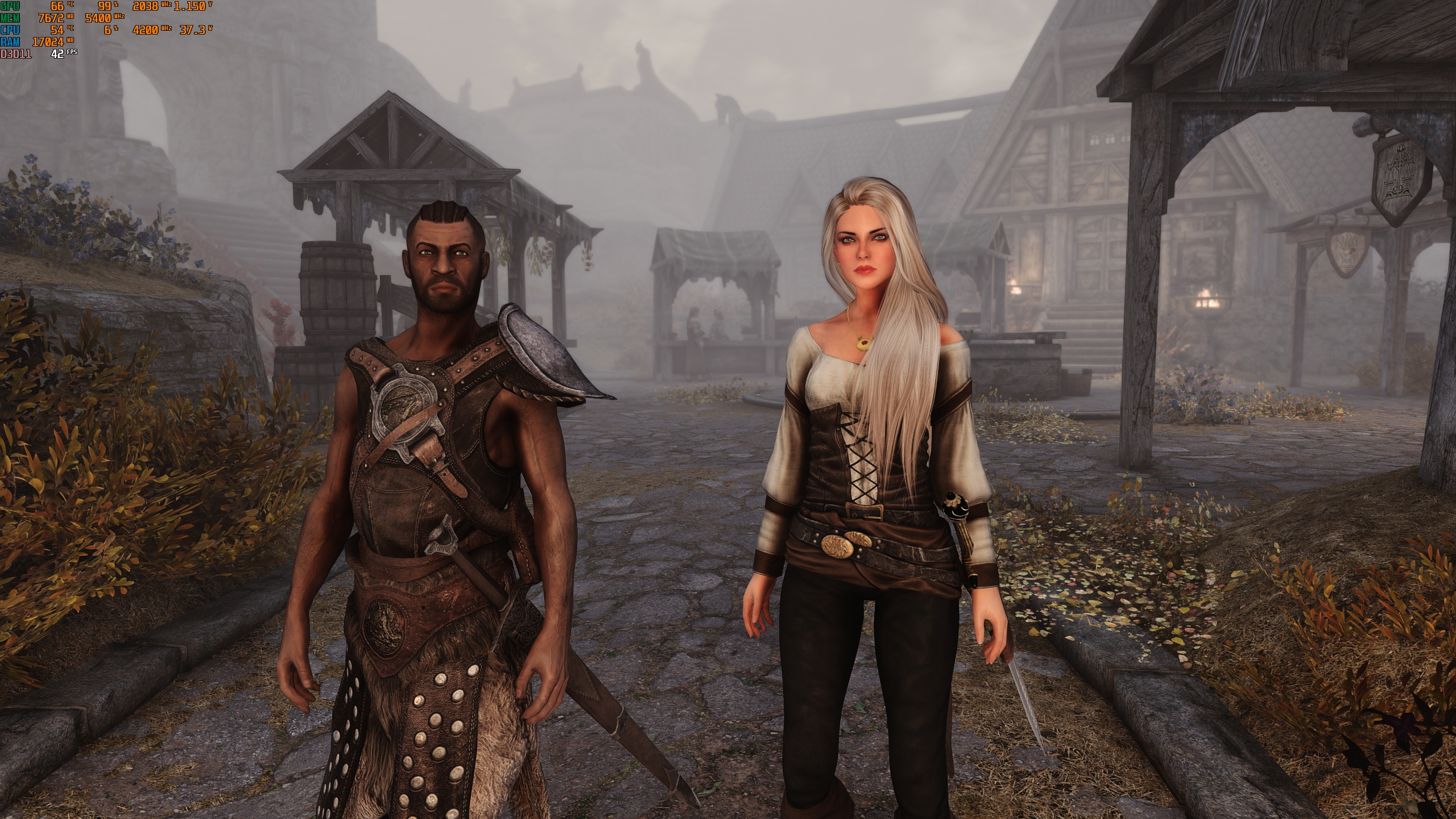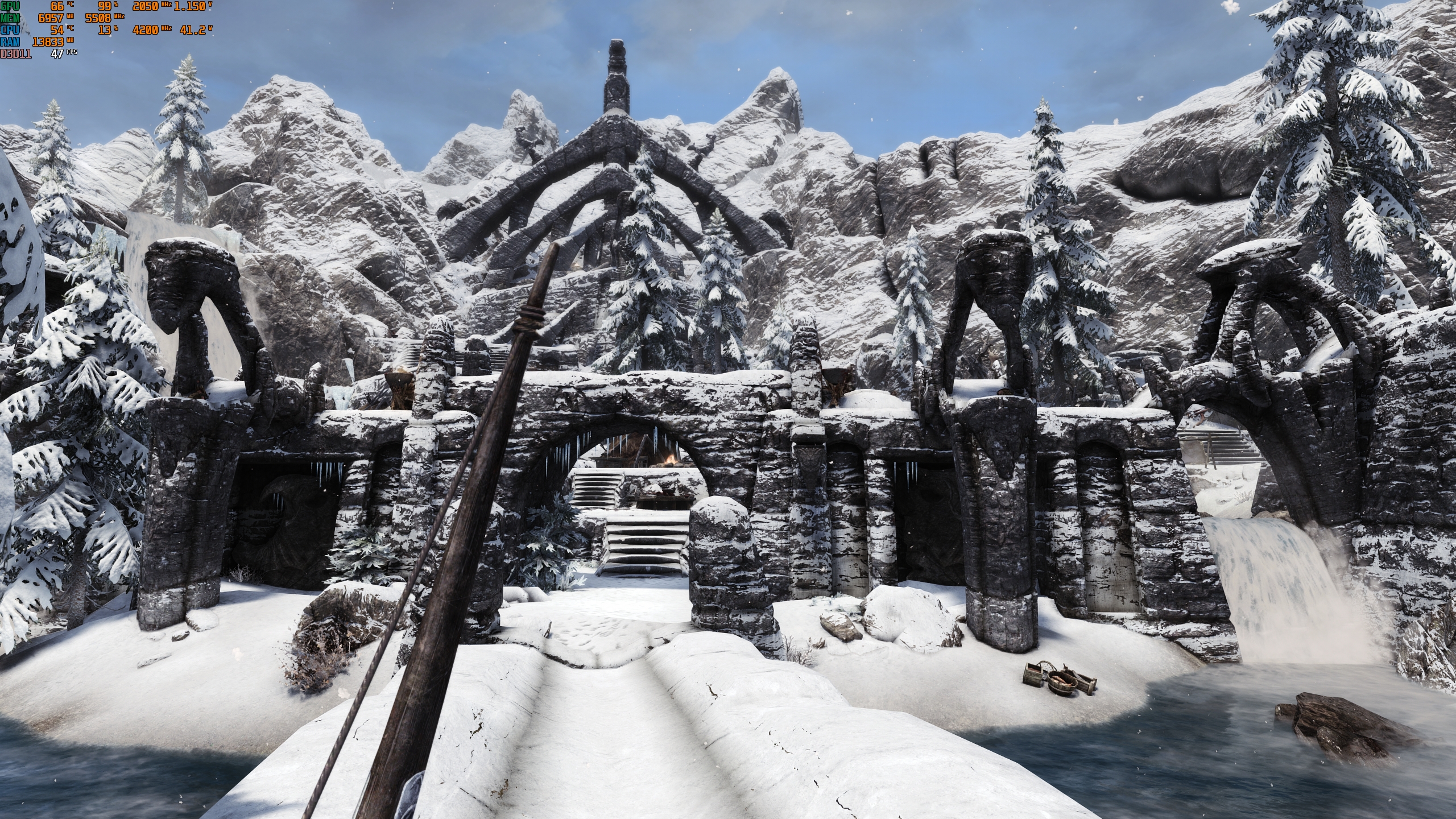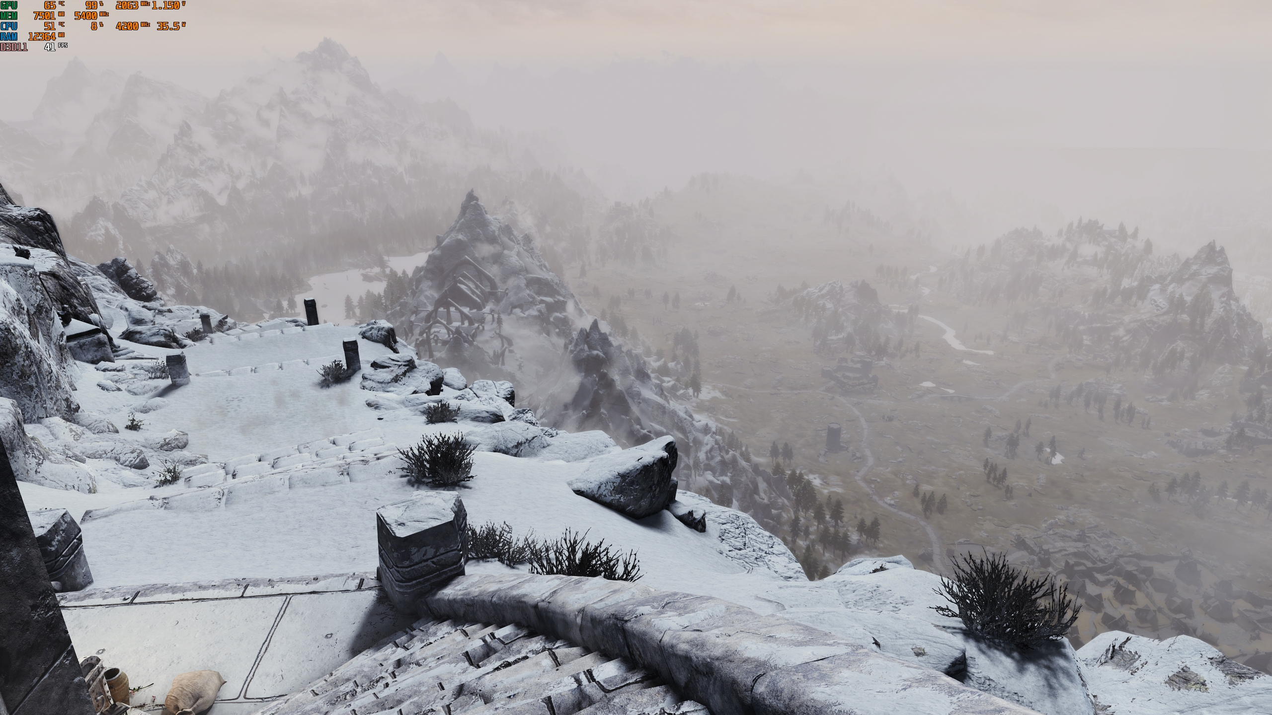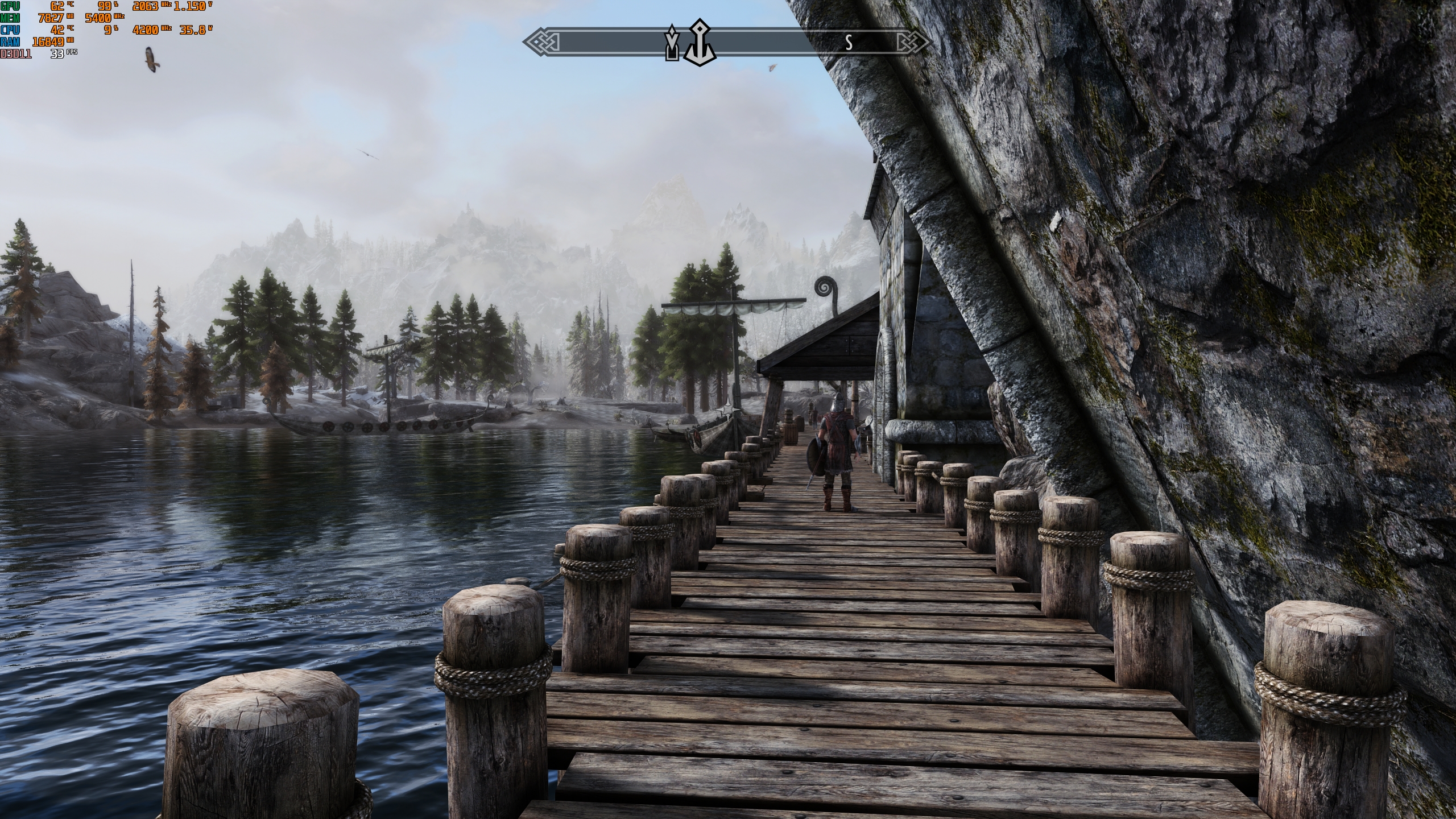 WQHD, BethINI High + BethINI Recommended Tweaks, Veydosebrom Vanilla Landscape + Sparse INI Setting (default geht nicht wegen den FPS), NVT ENB (Full Quality Ordner) für Cathedral Weathers, mit zusätzlich aktivierten ENB Effekten, aber auf Medium Qualität (und nicht High oder Ultra). Mit den wundervollen HD LODs. Das Ganze sähe mit Ultra+ INIs sicher nochmal besser aus, aber naja, mehr geht halt nicht.