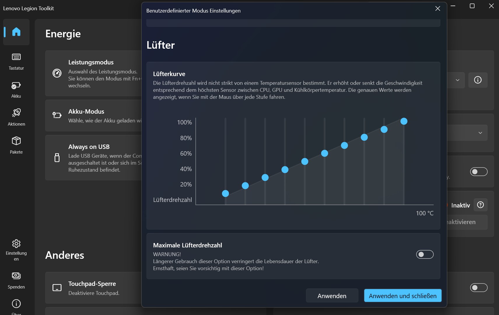 Habe noch kein Tool gefunden, wo ich die Drehzahl auf einen bestimmten punkt einstellen kann oder eine Lüfterkurve verwalten kann. Die meisten Tools erkennen den Lüfter nicht.
