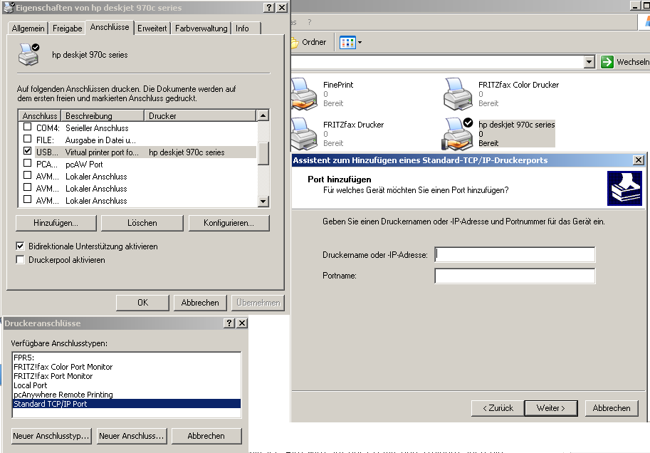 Den Drucker habe ich an meinen Router (Linksys WRT54G) gehängt. Dann habe ich beim Drucker am Bedienfeld mal eine IP-Adresse (192.168.1.10) die Subnetzmaske (255.255.255.0) und den Standardgateway (192.168.1.1) vergeben. Ich kann den Drucker jetzt von einem PC aus anpingen.