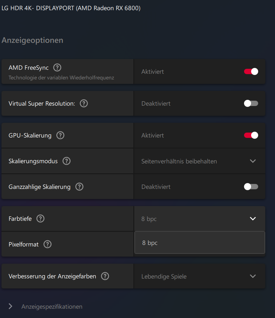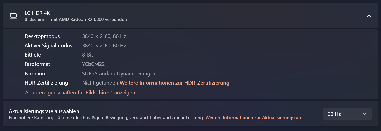 Das erste wäre die Farbtiefe, diese lässt sich nur auf 8bit einstellen und HDR(10) lässt sich gar nicht einstellen.