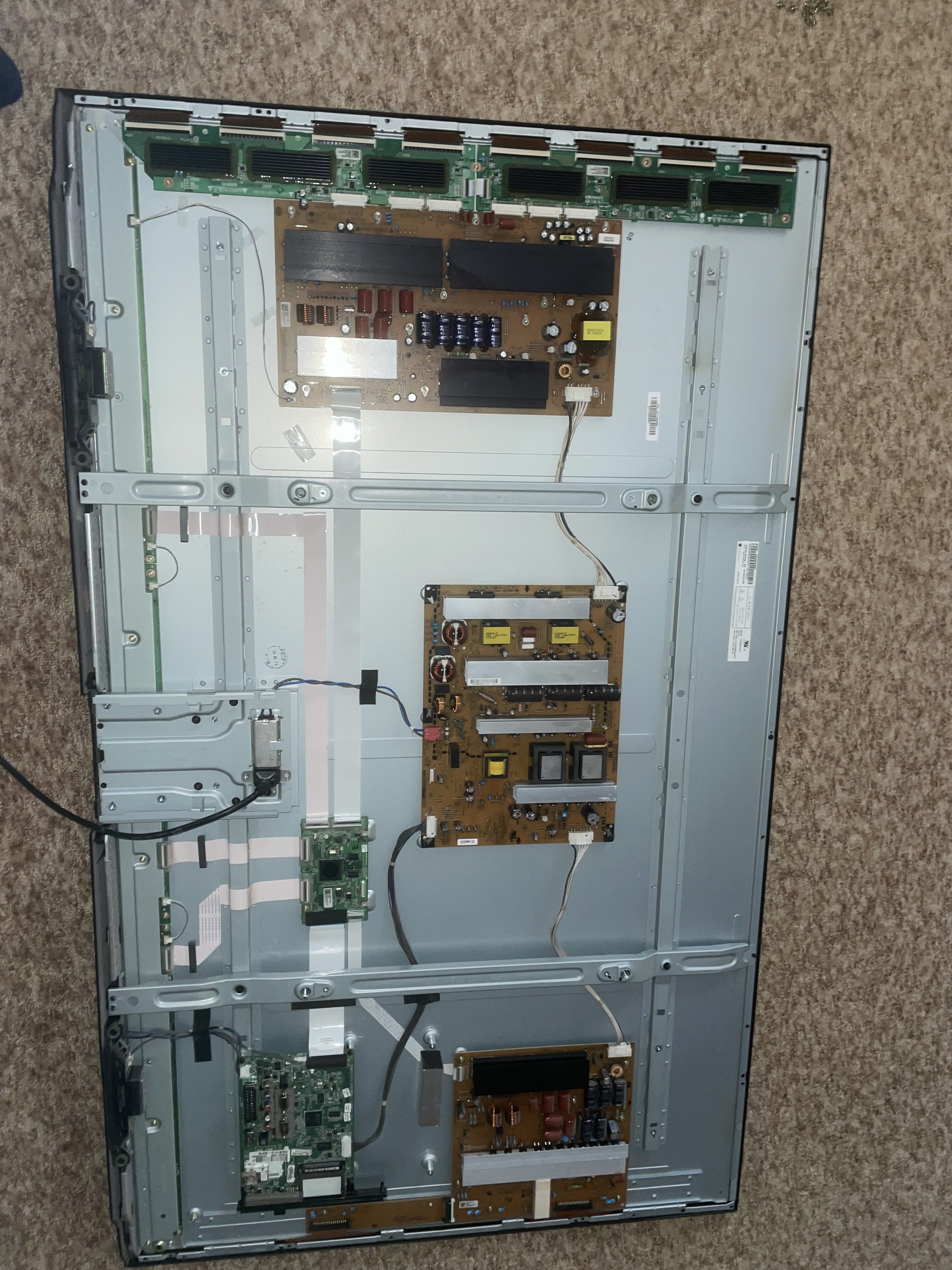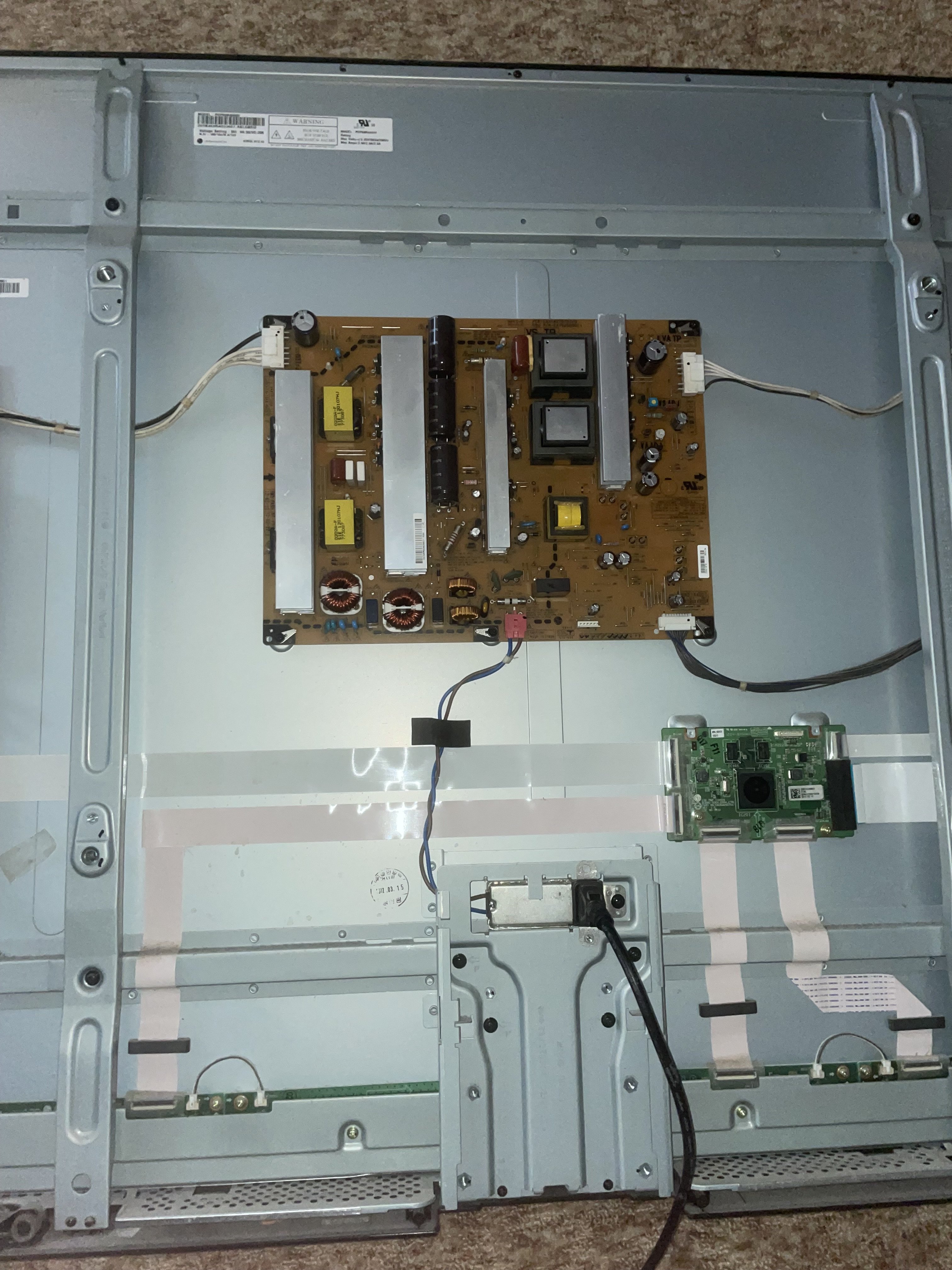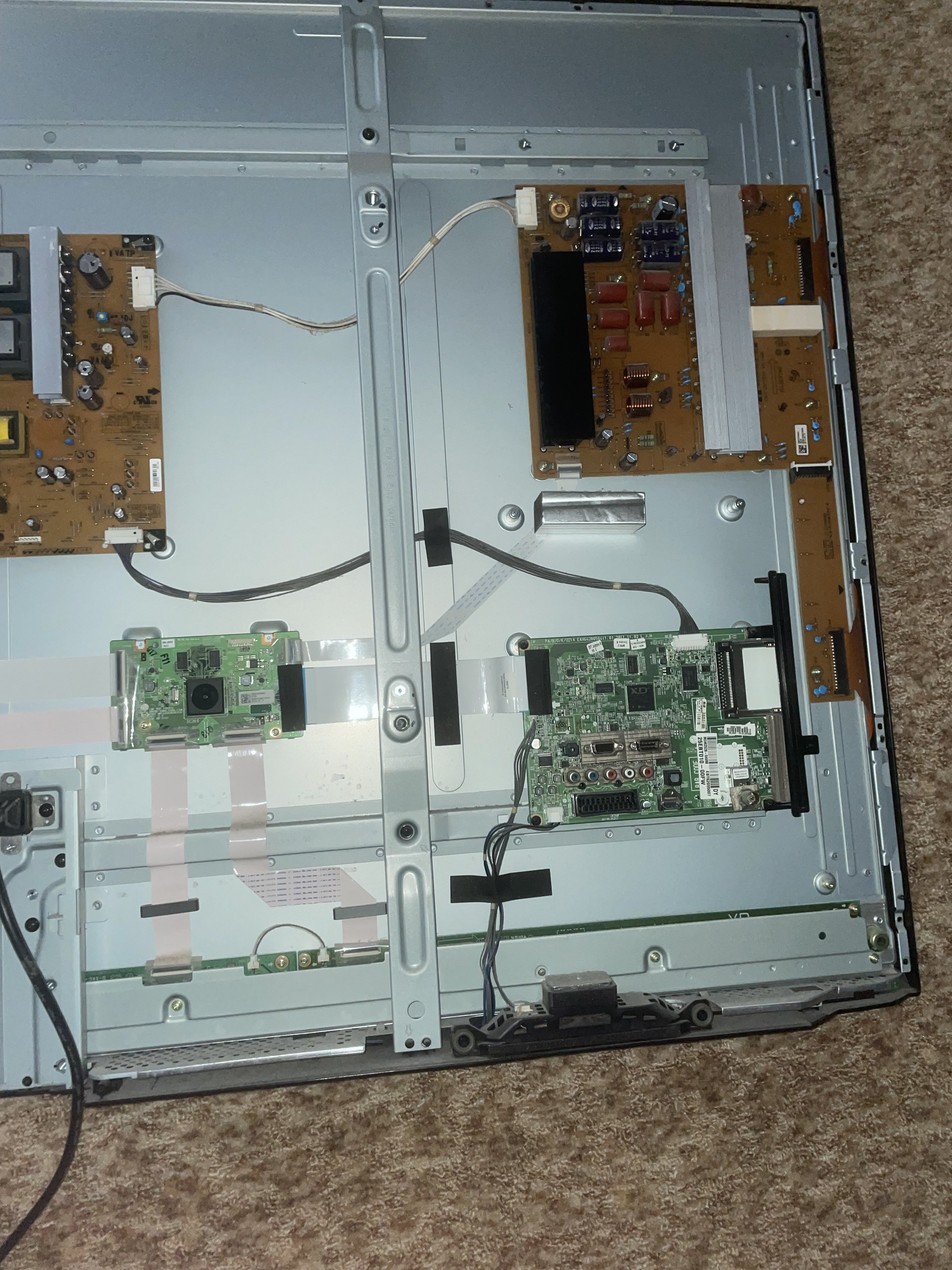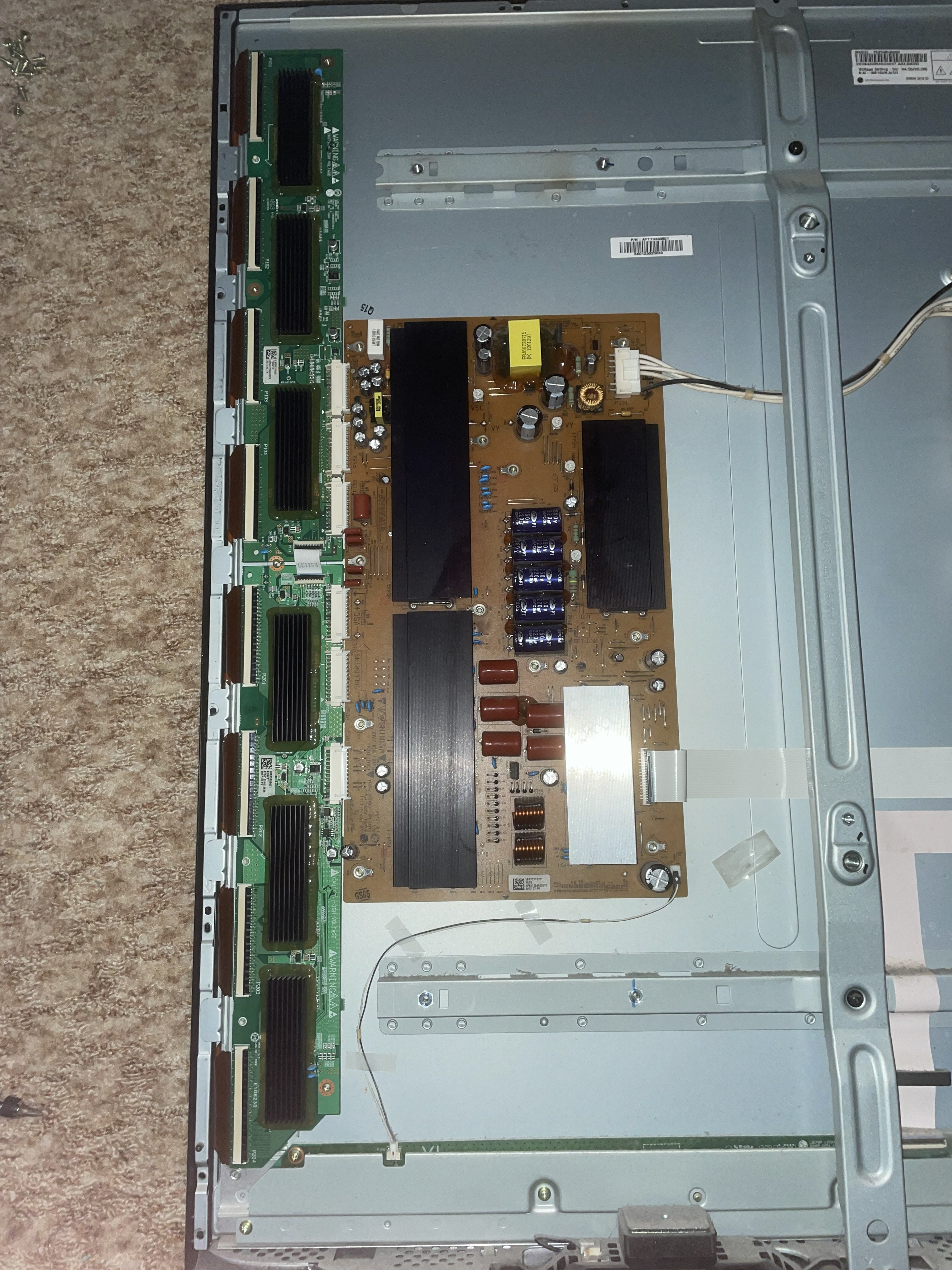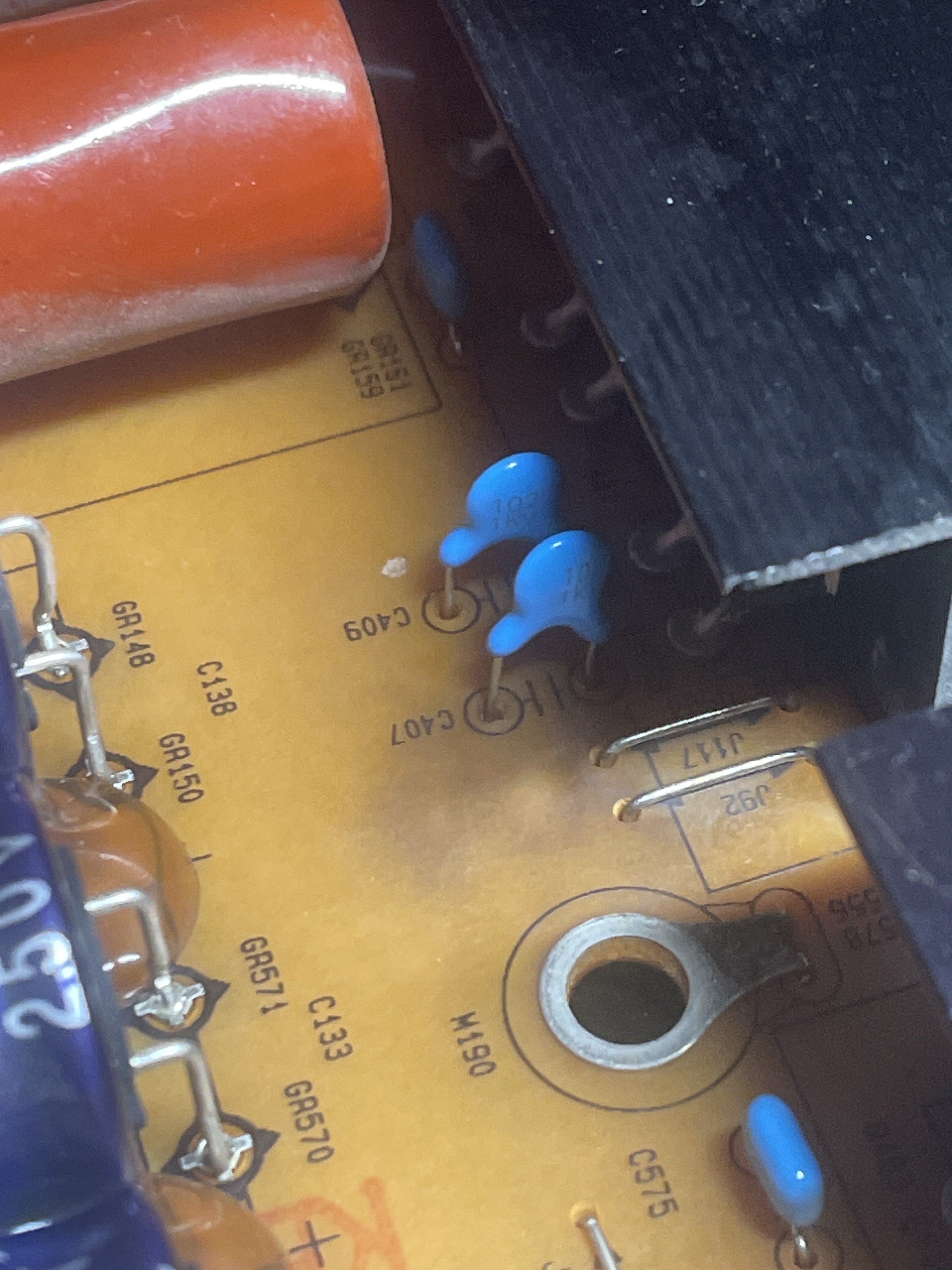 An einem anderen Fernseher (LCD) hatte ich dasselbe Problem, was aber durch ein paar neue Elkos gelöst wurde. Hier waren zwei (eher gesagt einer) Keramik Kondensatoren defekt, die habe ich ausgetauscht, jedoch wurde das Problem nicht gelöst.
