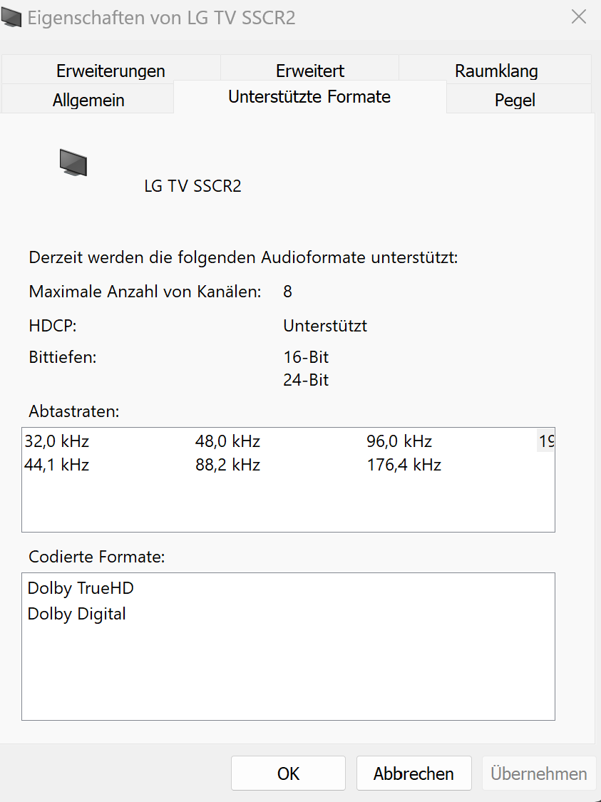 ich habe meine Nubert SP-200 Boxen über HDMI an den eARC HDMI Anschluss des LG C2 angeschlossen. Die Boxen verbinden sich aber immer nur über PCM, obwohl ich Dolby Digital auswähle. Bevor ich lange herumrede, im Anhang findet ihr die Audiosettings meines C2. HDMI 2 ist der eARC Anschluss, an dem die SP-200 hängen.