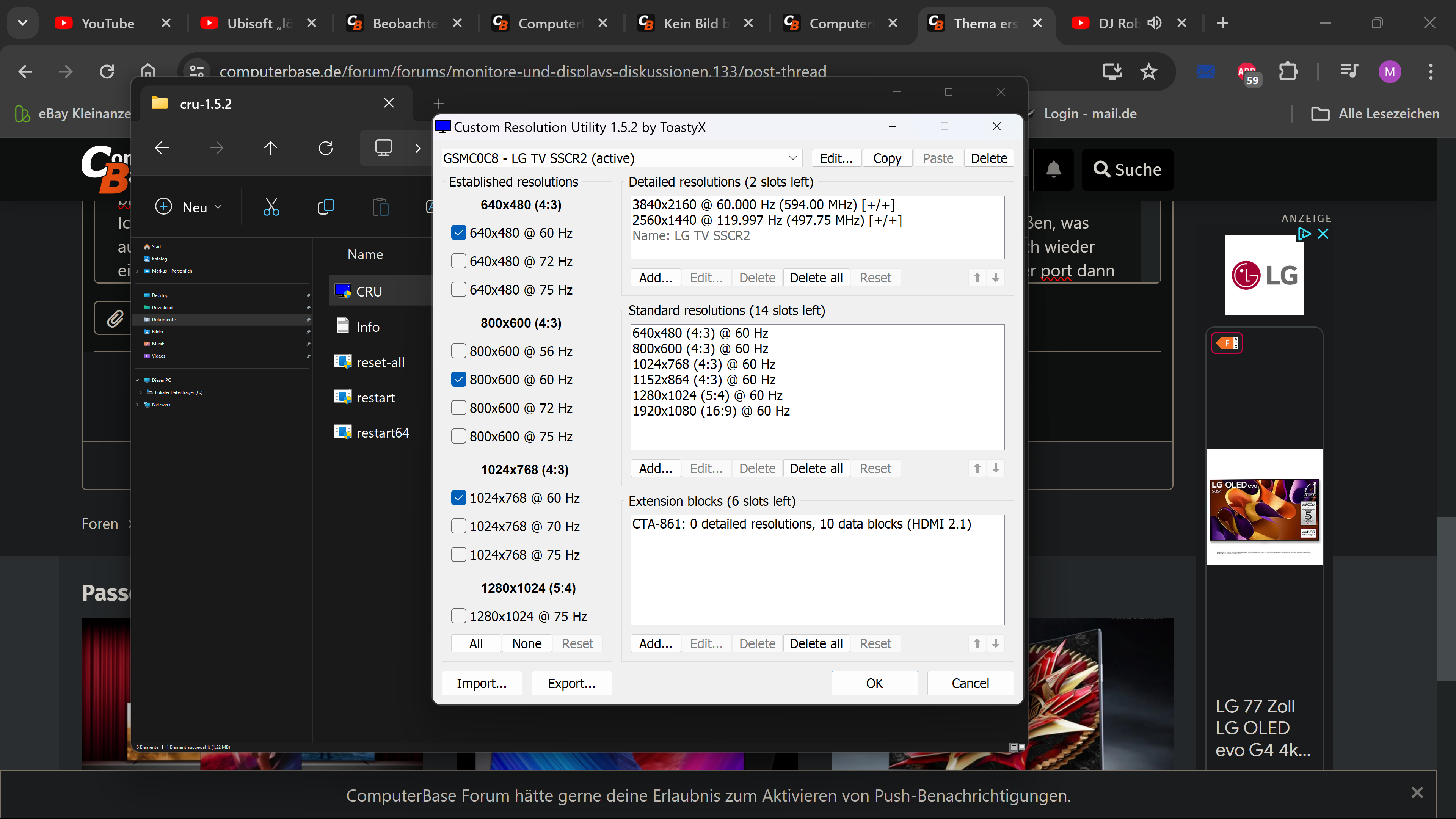 Ich habe dann wegen der probleme angefangen den tv direkt mit dem pc zu verbinden und den avr an den tv anzuschließen, was auch nicht geholfen hat. Die lg tv haben ja die funktion deep colour und wenn ich diese ausgestellt habe dann gab es auch wieder ein bild, das problem dabei ist aber das 4k 120hz, hdr und auch gsync an die funktion deep colour gebunden sind weil der port dann als hdmi 1.4 oder 2.0 port läuft. Bis vor kurzem war die einzige möglichkeit 4k 120hz und hdr zu nutzen ein adapter von displayport auf hdmi was aber auch nicht toll war weil der adapter tonaussetzer gemacht hat. Ich wurde damals vom nvidia support gebeten eine edid datei zu erstellen und habe dies mit dem monitor asset manager gemacht und in der edid liest der pc immer aus das der tv nur 4k 60hz kann stelle ich deep colour aus dann sind dort nur noch 4k 30hz angezeigt also immer genau die hälfte. Seit gestern beschäftige ich mich auch noch mit dem custom resolution utility von toasty, das zeigt mir auch an das monitor nur 4k 60hz kann, dort manuell 120hz einstellen geht nicht weil die zahlen dann rot unterlegt ist und man das nicht übernehmen kann. Das problem mit der 4090 die montan nicht da ist, seit 2 tagen nutze ich ja die igpu dort funktioniert es ja auch nicht, was wohl nahe legt das die 4090 wohl nicht das problem ist. Wenn ich den pc mit der igpu starte sehe ich den bios bildschirm und dann kein kein signal oder schwarzes bild und dann stelle ich einmal deep colour aus und wieder an dann habe ich auch ein bild wenn das nicht funktioniert dann stecke ich das hdmi kabel einmal aus und wieder ein, dann geht es meistens auch wieder. Ich weiß echt nicht mehr kein support oder sonst irgendjemand konnte mir bisher helfen, ich hatte hoffnung das die 4090 das problem ist seit gestern weiß ich aber das es mit der igpu auch probleme gibt. Vielleicht weiß hier jemand weiter.
