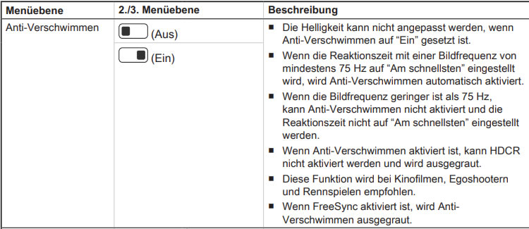 Ich vermute mal, das mit diesem Anti-Verschwimmen Modus, der Overdrive Modus gemeint ist, aber genau weiß ich es nicht. Ich denke aber nicht, das der Modus mir so wichtig wäre, dafür dann auf G-Sync Kompatible zu verzichten. Vor allem wird mir das Bild mit diesem Modus, wenn man es aktiviert hat, viel zu dunkel!