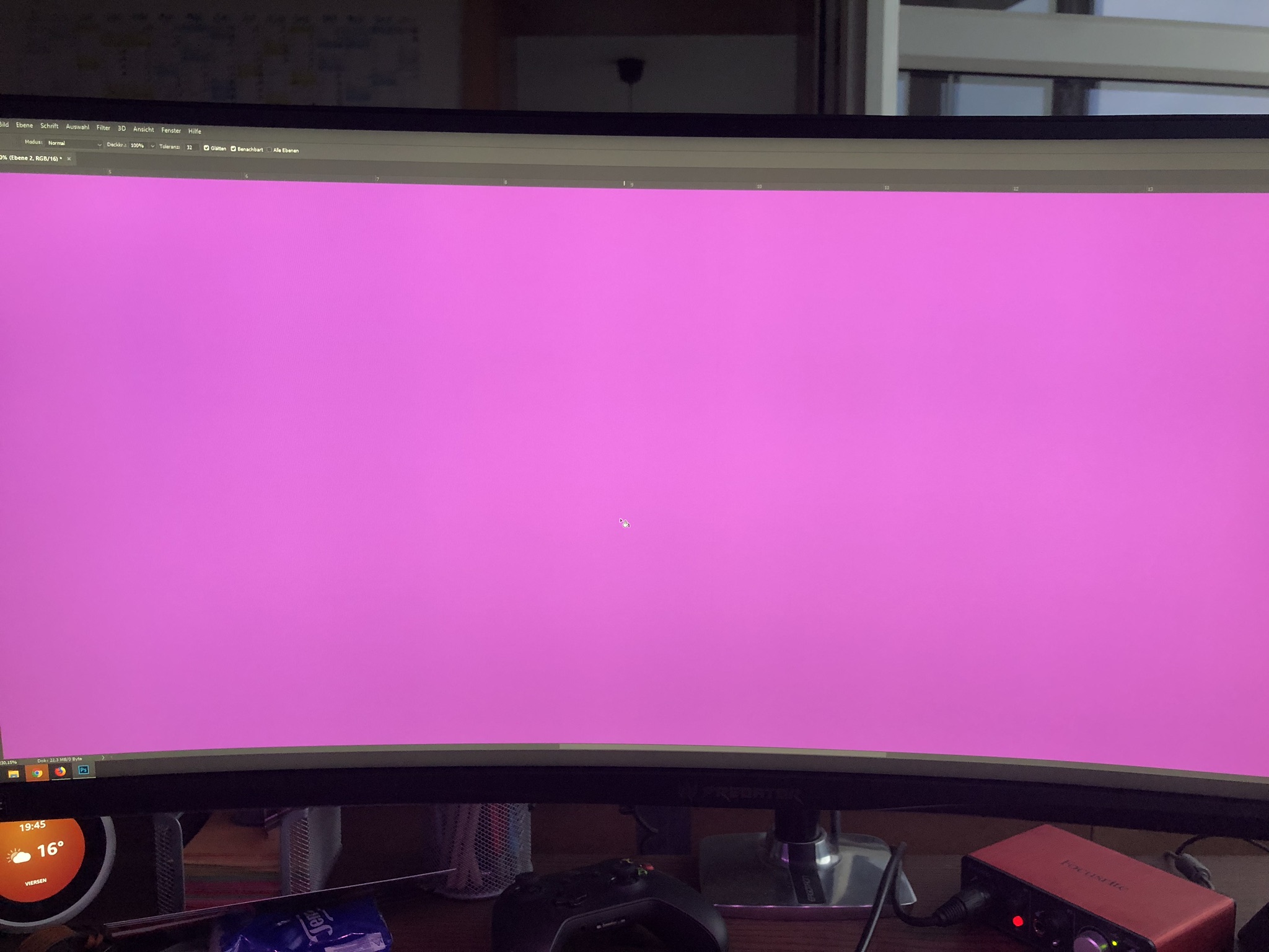 Allerdings muss ich den einschicken in die RMA. Ungefähr mittig (eher links von der Mitte) hat sich ein fast kompletter senkrechter Streifen Pixelfehler im Blau/Rot Bereich ergeben: