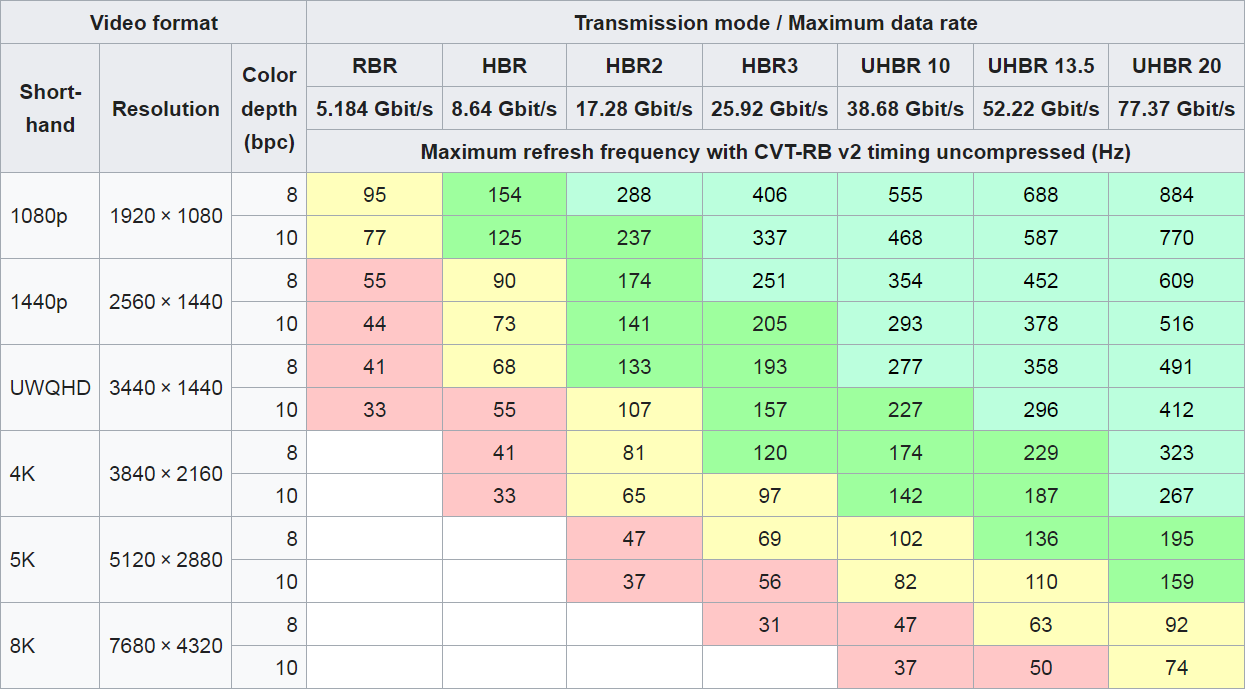WilliTheSmith hat oben den englischen Wikieintrag zu DP schon verlinkt. Der ist genau wie der zu HDMI immer zu Rate zu ziehen, wenn es darum geht, ob eine bestimmte Version des Anschlusses eine bestimmte Kombination aus Auflösung, Bildwiederholfrequenz, Bitrate und Farbunterabtastung unterstützt. Der englische Artikel hat auch noch aufklappbare Tabellen für die Unterscheidung zwischen 4:4:4, 4:2:2 und 4:2:0. Das ist mittlerweile ein Dschungel, den die Hersteller bewußt zur Verwirrung der Kunden ausnutzen, und für den man durch die Tabellen navigieren muß.