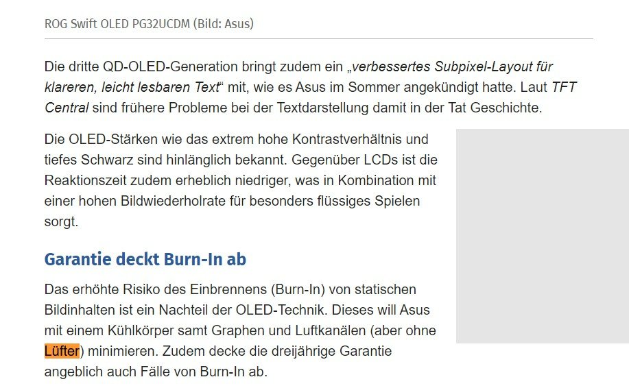 Unnötigerweise (zumindest in meiner Nutzung auf 120Hz) hat er stets einen aktiven leisen Lüfter, denn man wenn es sehr leise ist, aber doch wahrnimmt und meinen leisen PC im Idle übertönt.