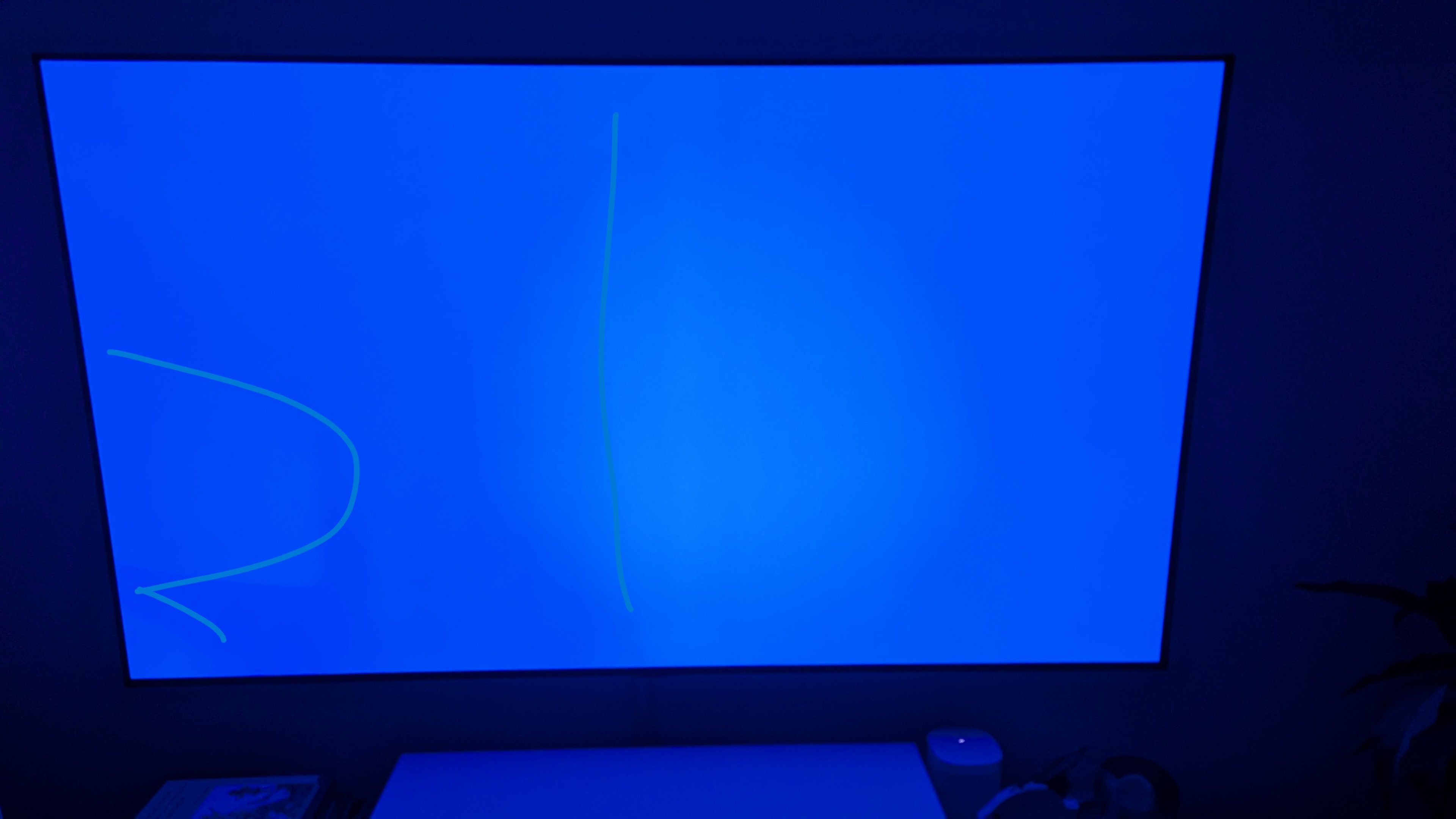 Habe erst gedacht, dass kommt vom Schatten (links steht eine Lampe, die als Schatten Objekt perfekt zu dem linken, länglichen Fleck passt), also alle Lichter ausgeschaltet, Vorhänge zu (Fenster sind links von der Lampe), das ist aber definitv etwas vom Panel. Der TV ist zwei Jahre alt (11/2022), also zwei Monate aus der Gewährleistung. Ich lasse gerade eine große Pixelreinigung durchführen, aber ich befürchte, da ist was größeres kaputt.
