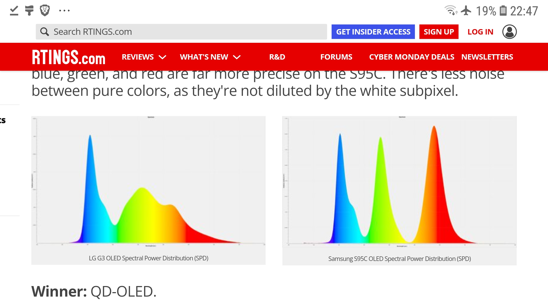 Reinere rot- und Grüntöne sind somit möglich und ja, ich hab woled und qd-oled zum Vergleich hier stehen und mich schon immer an dem fehlenden Tiefrot mit Drift ins hellere Fuchsia sowie den teilweise blassen Gelbtönen mit Hang zur Grünverfärbung bei woled gestört.