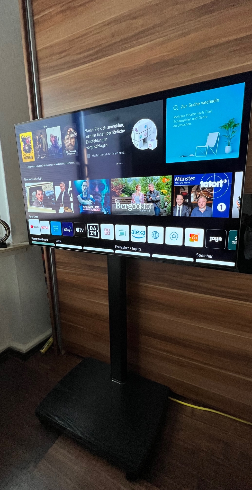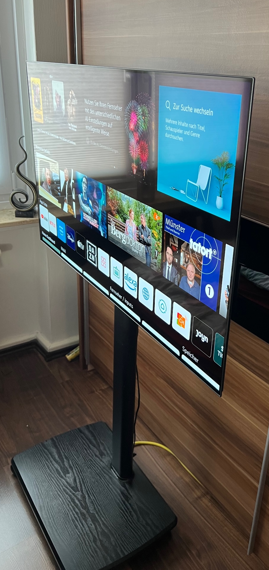 So ein 48er Oled lässt sich aufgrund seiner Dünnheit wunderbar auf so ein verschiebbares Rack packen. Kann man sich dann schön mittig vors Bett schieben. ( siehe Fotos )