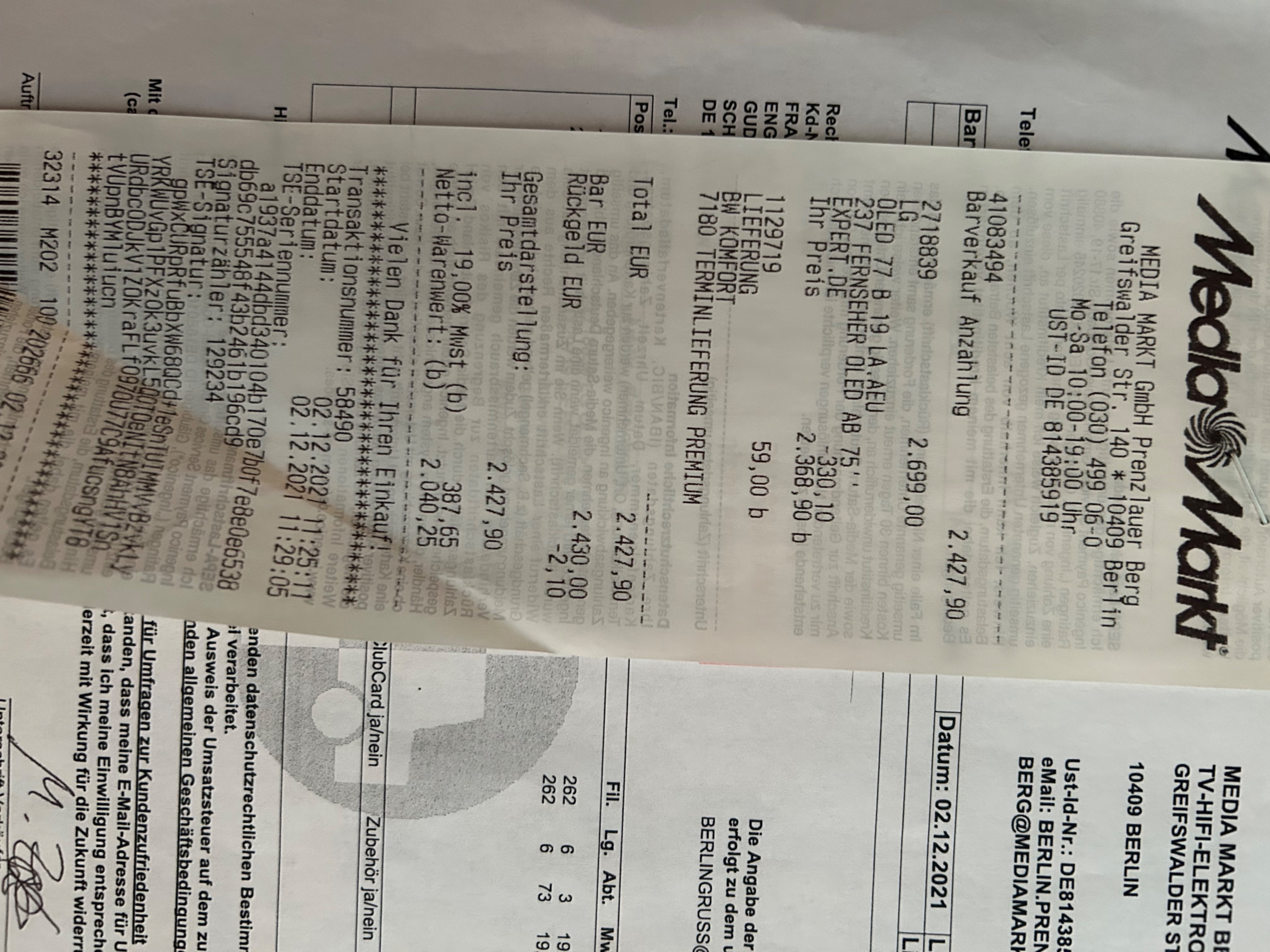 Anbei mal die Rechnung von dem alten Gerät da steht doch die Typ Nummer draufShark1705 schrieb:@Christian1976B Welcher ist es genau? Wenn das Gerät nur 2.500 € gekostet hat, glaube ich nicht, dass es das aktuelle Modell war. Es gab für diverse Serien einen Rückruf. Ich verstehe auch nicht so ganz, weshalb man den Fernseher wegschicken muss, normalerweise kommt ein Techniker ins Haus und der tauscht dann das Netzteil aus, zumindestens war das bei uns damals so.