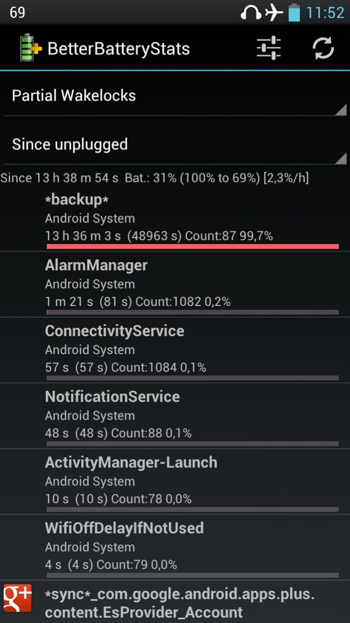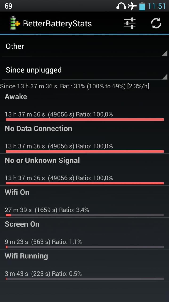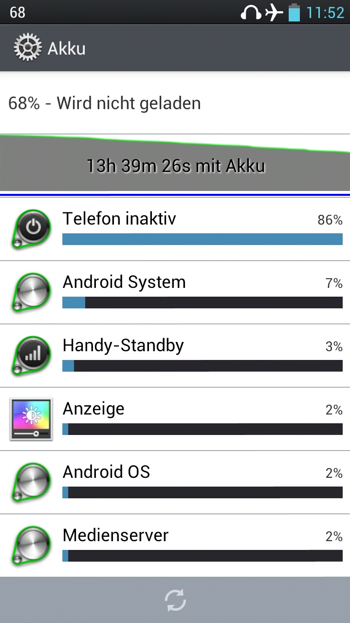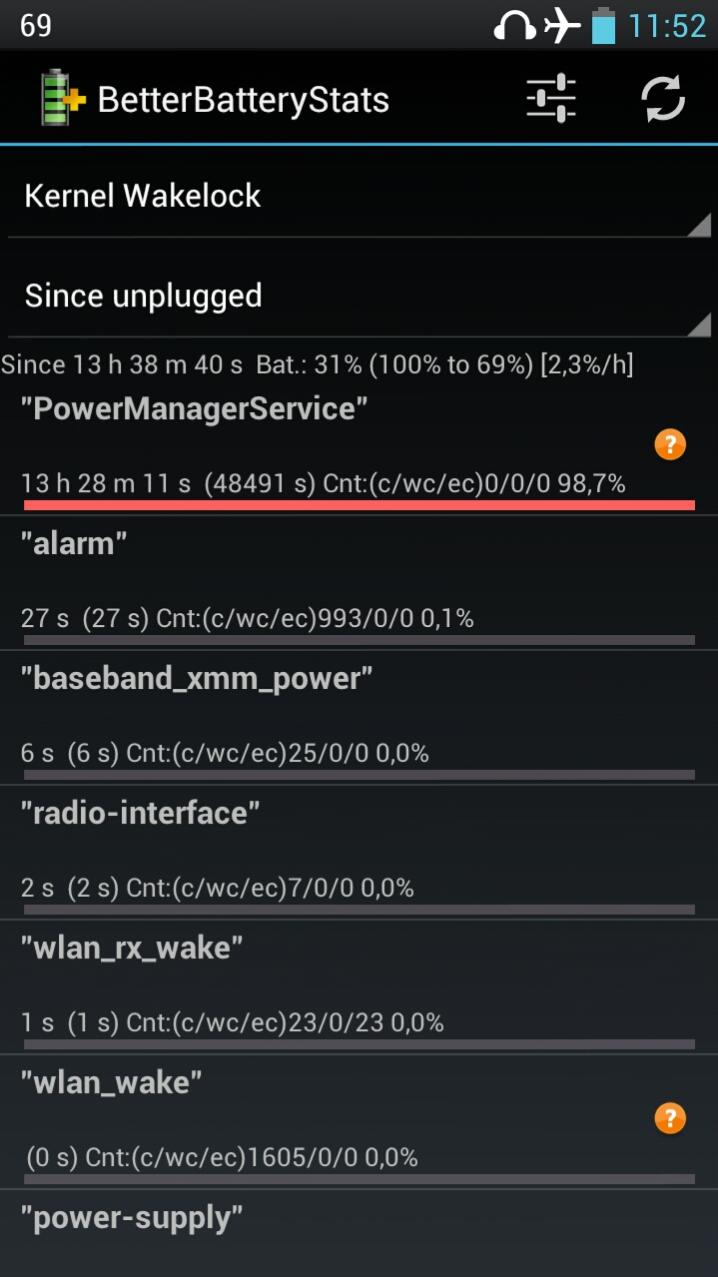 ich bin seit einigen Tagen stolzer Besitzer des oben genannten Phones und soweit auch ganz zufrieden. Lediglich der Verbrauch im Standby erscheint mir ein bisschen zu hoch. Nachdem ich das Gerät gestern abend auf 100% geladen habe, lag es nach etwa 14h Standby nur noch bei 55%. Während dieser Phase war der Flugmodus aktiviert, d.h. sämtliche Datennetze, GPS, Bluetooth & Co. waren deaktiviert. Mithilfe von CPUSpy habe ich herausgefunden, dass das Gerät von insgesamt 51 Stunden Betriebszeit (in dieser Zeit wurde das Gerät zweimal voll aufgeladen) nur knapp über 3h im DeepSleep-Modus war. Ich vermute, dass sich hierdurch der hohe Standby-Verbrauch begründen lässt.