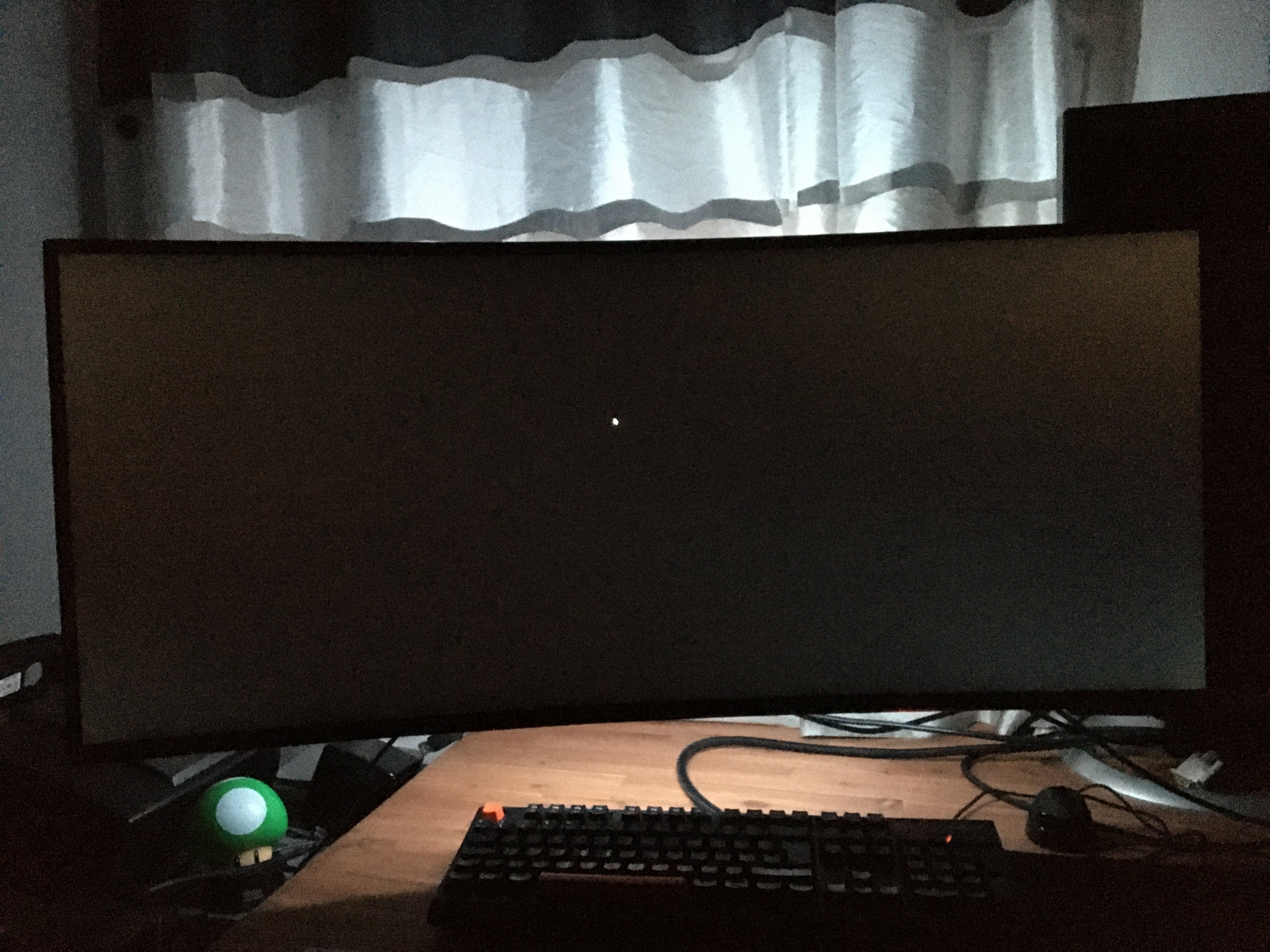 manchmal vermiss ich schon das bessere Schwarz und den geringeren Glow vom VA Panel. Der LG ist da schon teilweise sehr grau/gelb anstatt schwarz, insbesondere wenn man nah dran sitzt. Auf dem Bild sieht’s besser aus als es ist, aber man erkennt dass er rechts unten schon einstrahlt. Das geht teilweise bis zur jeweiligen Mitte hoch.