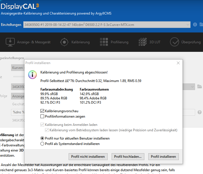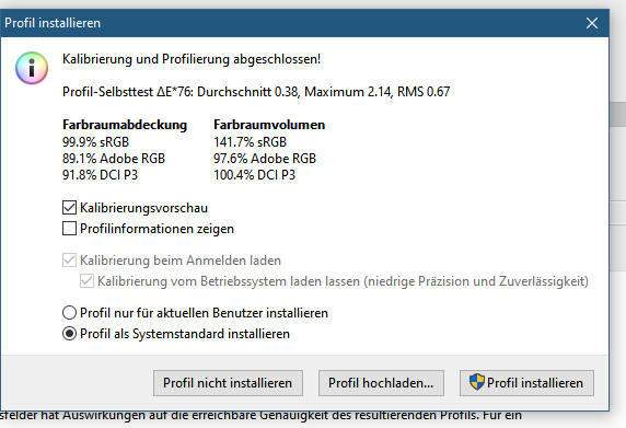 Bei Farbverwaltung - Systemstandards Häkchen setzen bei Windows Bildschirmkalibrierung, damit das ICC Profil auch geladen wird (Braucht man, wenn man keinen Loader installiert hat)
