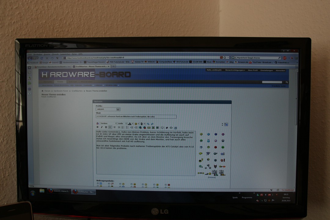 Nun ist aber folgendes Probelm nach meheren Treiberupdate der ATI Catalyt also von 9.12 bis 10.6 kamen die Probleme, und zwar hatte ich nie nen Schwarzen schmalen Rand am Bildschim ringsum DVI, da ich jetzt aber HDMI nutze und auch alles gestochen scharf sein soll kommt neuerding immer nen schwarzer Rand mit auf dem Bildschirm siehe Bilder, hatte den treiber schonmal komplett entfernt neu (10.1) drauf gemachtund da gings dann und nach den updates von 10.2-10.6 trat das Problem sporatisch auf mal mit Rand mal ohne, hab die Treiber und software alles runter geschmissen und komplet ne den 10.6 aufgesetzt, aber trotzdem das Problem, liegt es nun an der Karte oder am Monitor, kennte das von nem Freund mit nen 42 und FULL HD das erst alles ordentlich angezeit wurde nach dem man JUST SCAN im Ration eingestellt hatte, bei mir am LG gibts aber nur Overscan und RTC, wenn ich Overscan anschalder wird der Rand von 3 m´cm auf 1.5 cm verkleinert aber trotzdem noch nen Rand.
