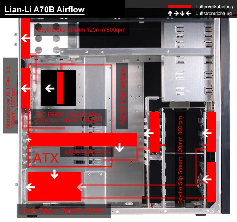 Im Gehäuse befinden sich nun 120mm: 4x Scythe Slip Stream 800rpm, 1x Standard-Lian-Li-Lüfter + 1x Noiseblocker NB-BlackSilentFan XL1 Rev. 3.0 mit 1000rpm sowie 100m-CPU-Lüfter Kaze Jyu: 1500rpm.