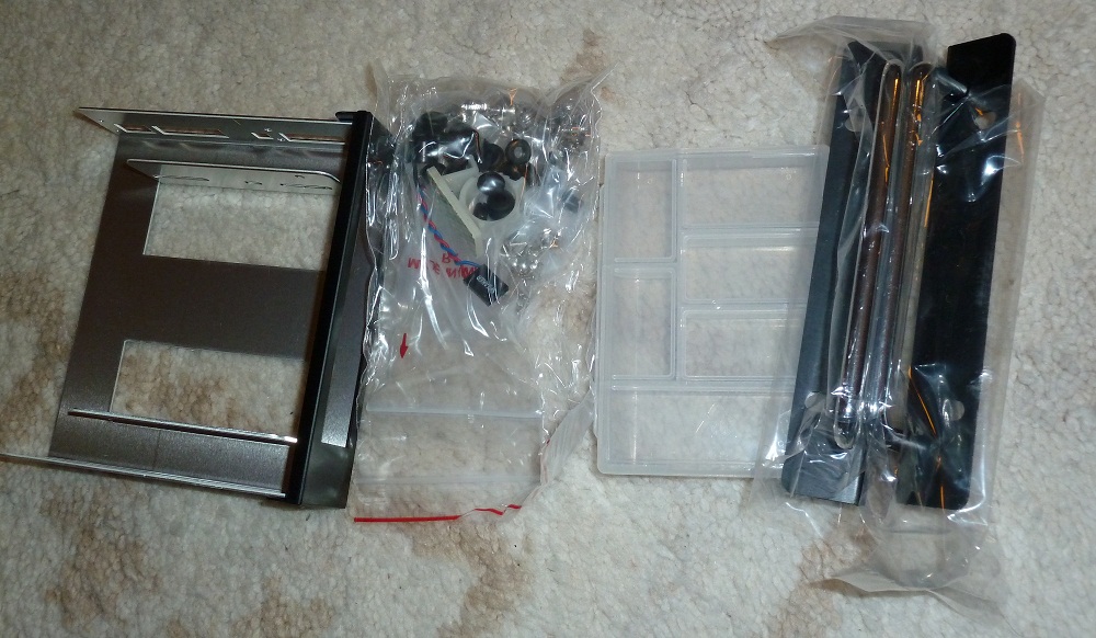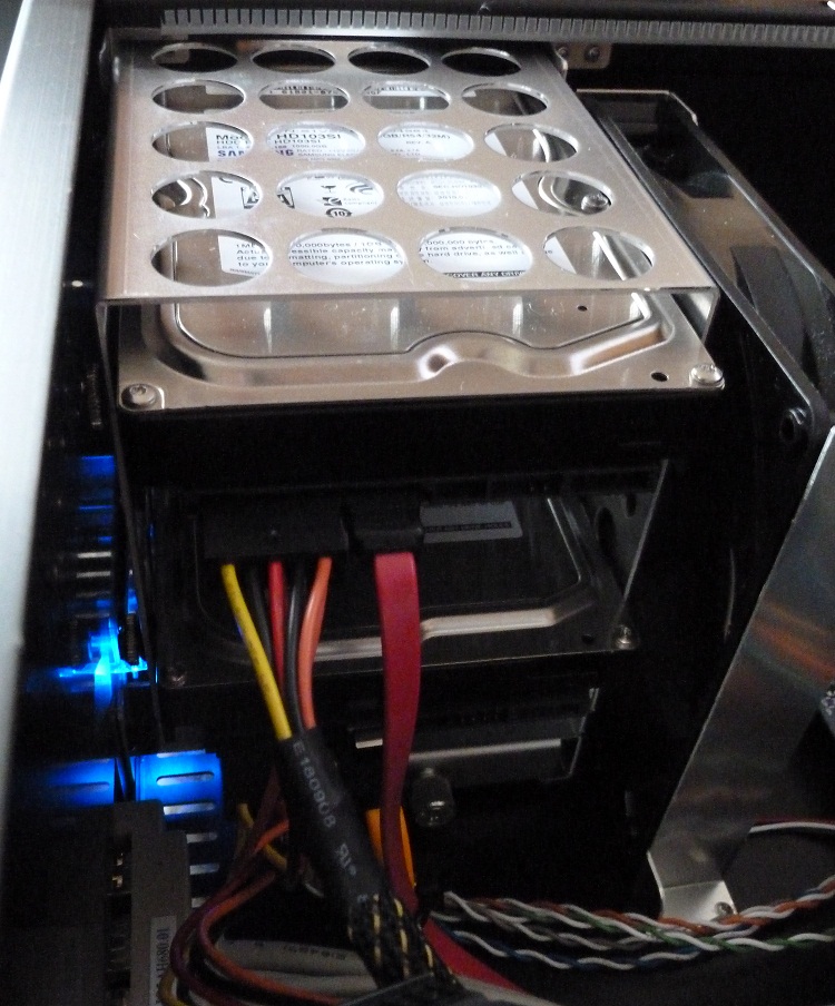 1. Bild: Laufwerkskäfig. Dieser ist unten durch eine Schraube befestigt und kann man dann rausziehen (erst gerade zurück und dann hoch). Dies geht für die Festplatten (Bild) und auch für die optischen Laufwerke. Bis zu vier Festplatten und bis zu zwei optische Laufwerke kann man montieren. Adapter für 3,5" auf 2,5" liegen nicht bei. Ich wollte den Käfig nicht ausbauen, da der HTPC bei der Fotoaufnahme lief und ich mich letztens beim Einbauen etwas doof angestellt habe. Die Festplatten sind (im Vergleich zum Sharkoon Tempation) gut entkoppelt. Montiert wird in der Reihenfolge: Schraube | Gummi | Käfig | Festplatte. Gummi und Schrauben sind mitgeliefert. Im Käfig sind an den richtigen Stellen Löcher, wo man die Gummis einsetzen kann. Also sind die Gummis nicht an der Wand vom Käfig, sondern direkt "in der Wand".