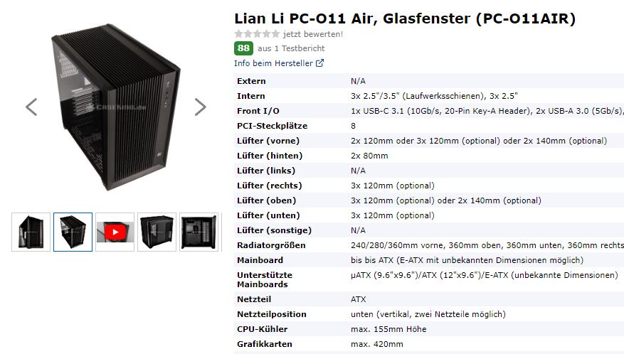 Man kann also auch luftgekühlte Systeme in dem Gehäuse betreiben, auch wenn ich zum aktuellen Zeitpunkt eher zum Air raten würde, es sei denn es ist in Zukunft n Wechsel auf ne Wasserkühlung geplant, dann sehe ich das normale O11 Mini im Vorteil.