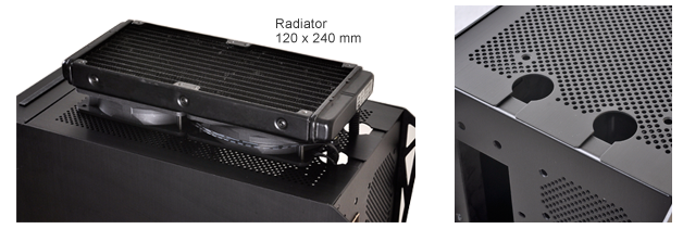 Abgeführt wird die Wärme über den vormontierten 120-mm-Lüfter auf der Rückseite und über Lüfter im Dach. Letztere sind allerdings optional, zudem kann der Raum auf dem Gehäuse auch für einen 240er Radiator genutzt werden.