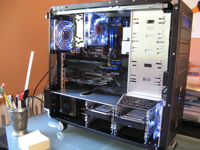 Ich habe folgendes Problem(chen): Ich habe das PC-X2000 Gehäuse von Lian Li. Dort können insgesamt 6 (2x3) Festplatten in Hot-swapable Festplattenkäfige eingebaut werden. Jeder Festplattenkäfig wird vom Netzteil mit Strom versorgt. SATA kabel müssen für jede Festplatte zum Mainboard gelegt werden. Bisher habe ich eine Festplatte in den einen Käfig verbaut.