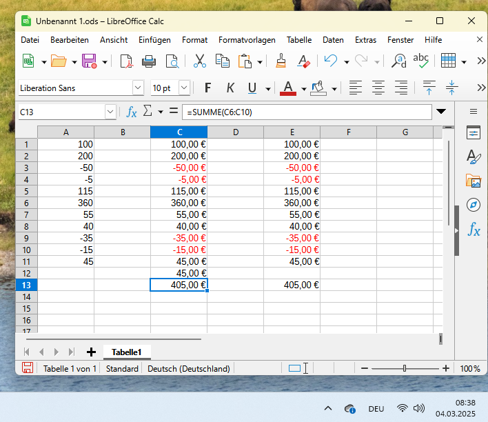 Was soll das, Libre? Ist es so, dass man keine Zelle mit in eine Formel nehmen kann, die selbst eine Formel ist, bzw. deren Wert das Ergebnis einer Formel ist? Also bitte...es geht um Plus und Minus, und da muss es so sein, dass alle markierten Zellen einbezogen werden, selbst wenn diese Ergebnis einer Summenformel z.B. sind.