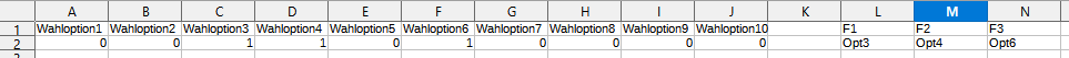 Für jede Wahloption steht das Ergebnis in Zeile 2: Die Zahl 1 für gewählt, die Zahl 0 für nicht gewählt.