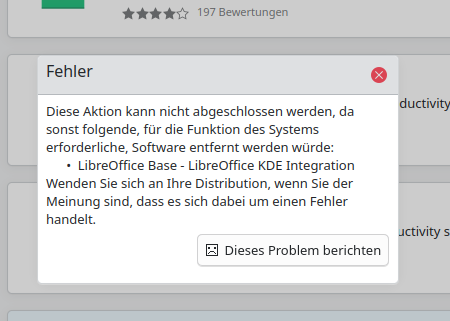 LibreOffice Base mit KDE Integration geht nicht, da es in Konflikt steht mit LibreOffice Base. Letzteres ist aber nicht installiert.