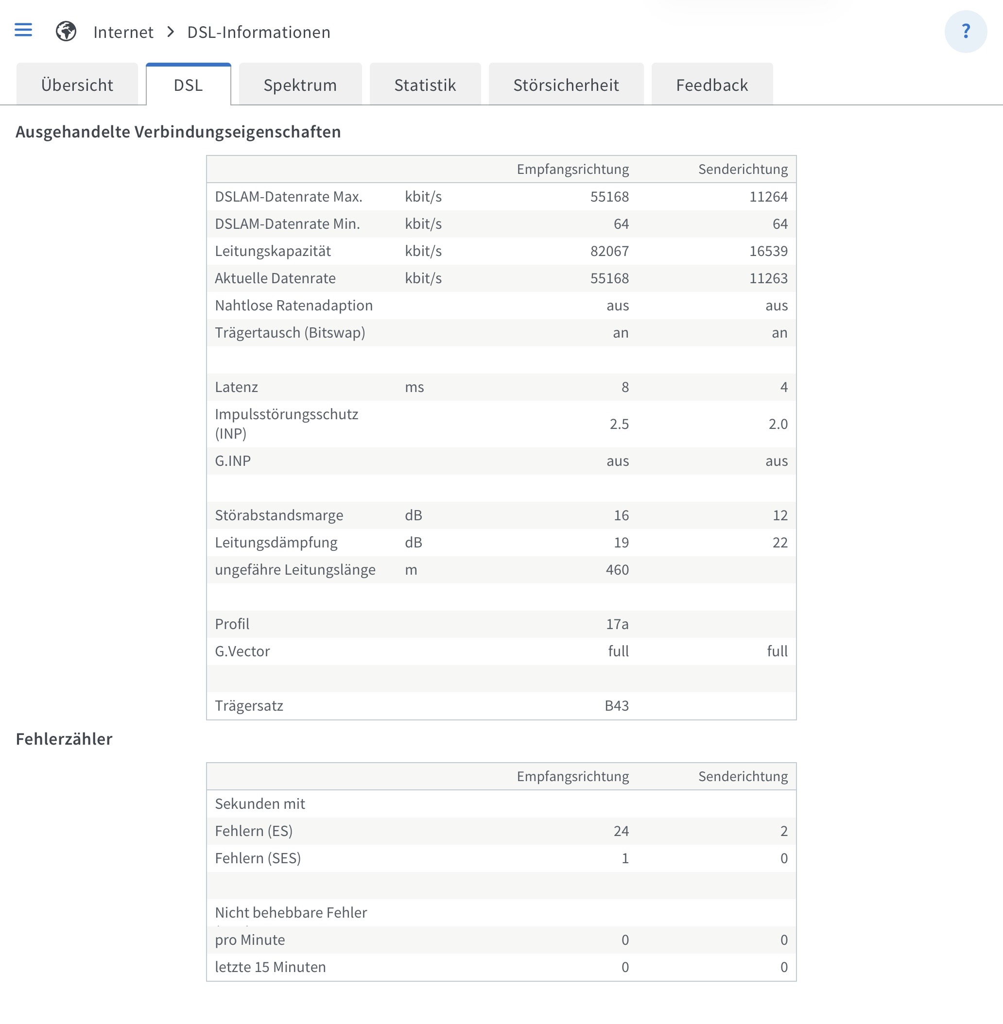 Du bist halt ~460 m vom deinem DSLAM entfernt. Mehr kann man da nicht rausholen. Und die paar Fehler, die da unten in der Tabelle aufgeführt werden, sind egal, weil es sehr wenig sind. Wenn da ein paar tausend pro Sekunden aufgezählt werden, ist das eine andere Sache, aber du hast da immer nur einen pro Lichtwechsel. Der fällt gar nicht ins Gewicht.