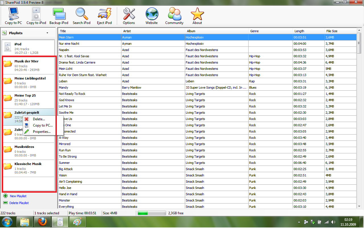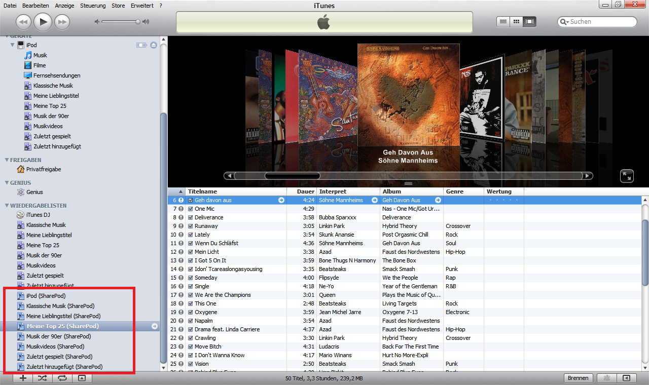 //.. Also die Playlisten, die sich auf dem Ipod befinden, werden auch mit Sharepod erkannt und mitgesichert (Bild1)...