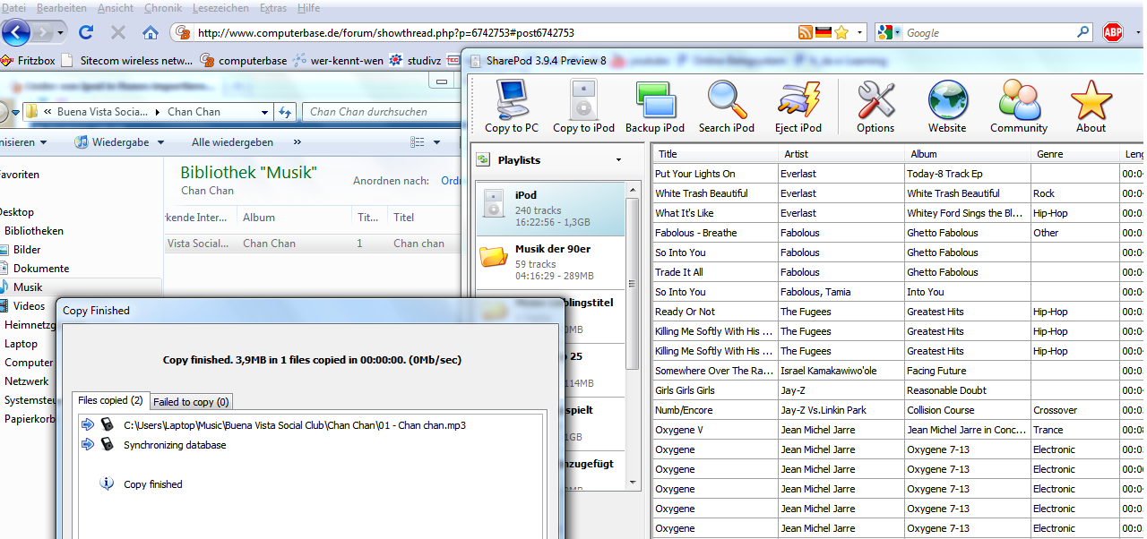 Angeblich kann man bei Sharepod MP3s per Drag & Drop auf den Ipod ziehen. Einfach MP3 "drag" und im Hauptfenster "drop". Könnt ihr das mal ausprobieren? Bei mir geht es nicht. Es kommt als Mauscursor der durchgestrichene Kreis, also, dass man nichts droppen kann.