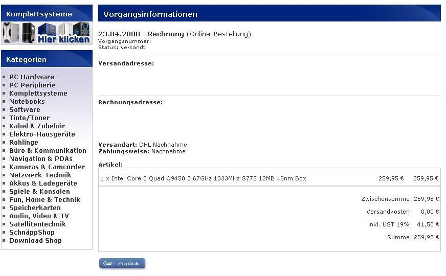 blaOutlaw schrieb:Wie gut, dass ich meinen Q9450 boxed für 259 Euro (inkl. Versand) bekommen habe