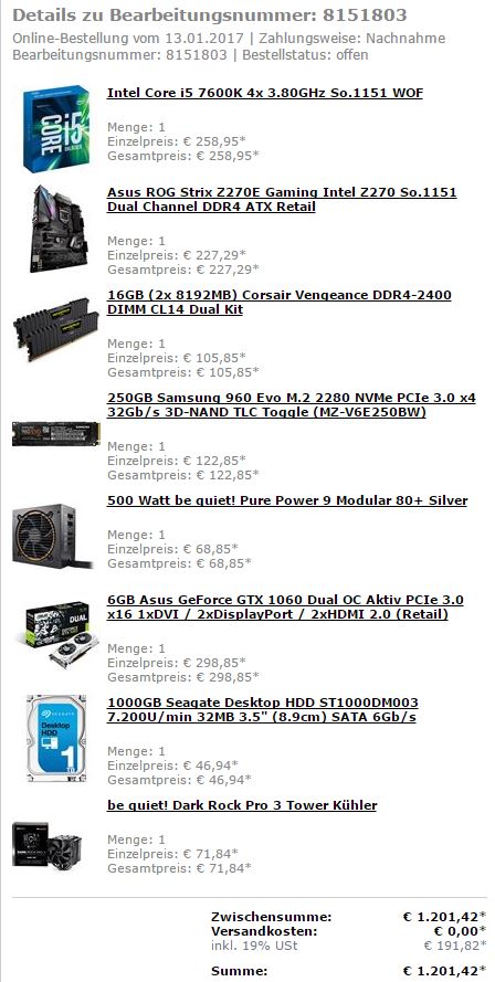 Für einen Kumpel bestellten wir bei Mindfactory am 13.01.2017 ein zusammengestelltes System für ihn. Bei der Zusammenstellung habe ich stets darauf geachtet, dass alles lagernd markiert war... etc.