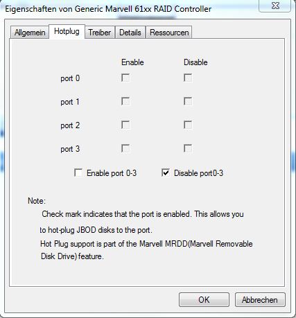 Der Marvell-Controller installiert sich als RAID-Controller. Das Hotplug macht bei einem IDE-Controller keinen Sinn, daher kannst du wahrscheinlich auch keinen Haken setzen. Eigentlich sieht es soweit alles gut aus - wieso es nicht funktioniert, keine Ahnung.