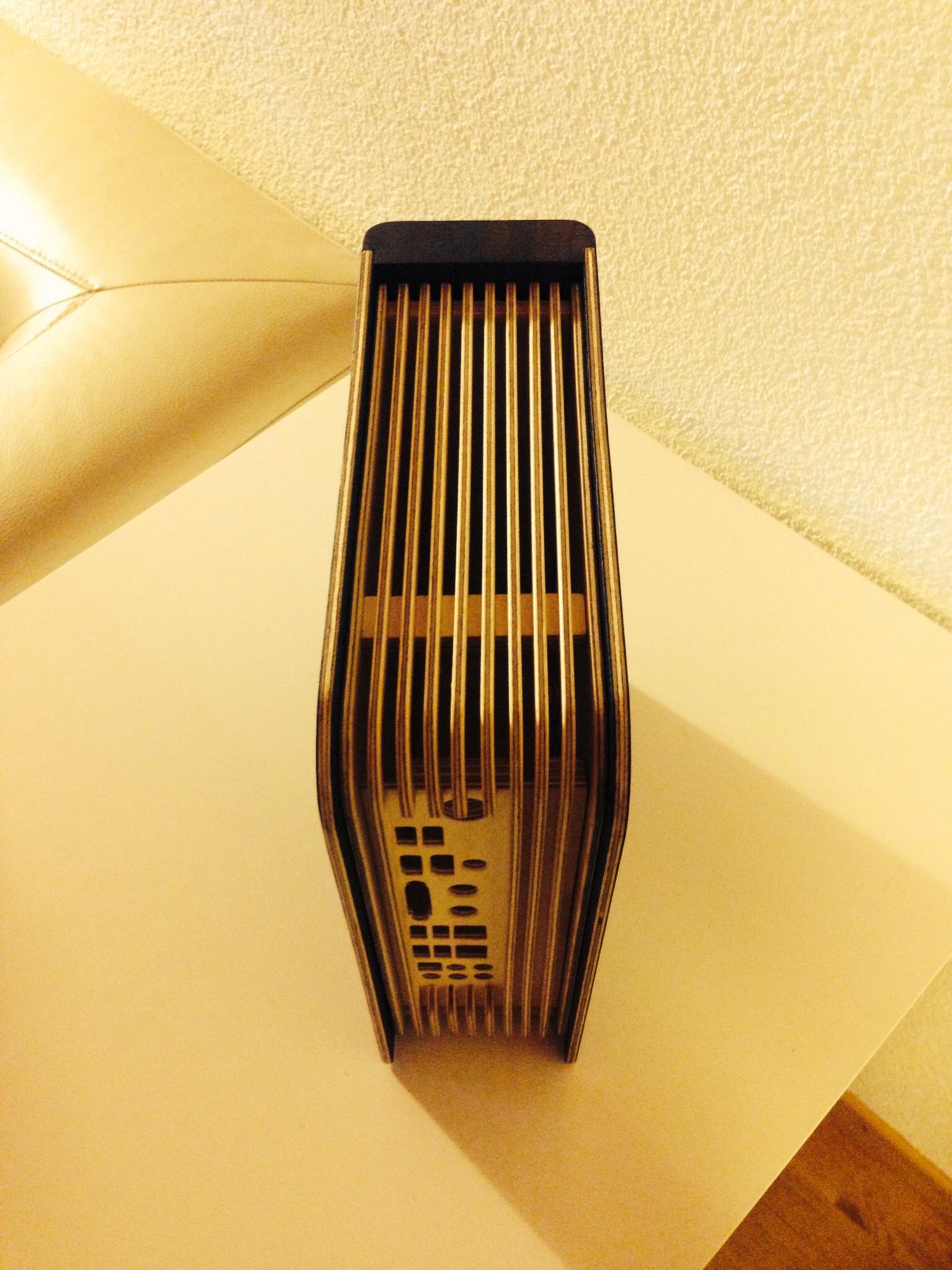 Nun zu deiner anderen Frage. Bisher habe ich zwei PC zusammengestellt und -gebaut. Dass ich ein Gehäuse selber konstruiere und umsetze ist bei mir mit meinem oben vorgestellten Modell absolut Premiere. Der Anreiz ein Holzcomputer selber herzustellen entstand, als ich die ersten Holzgehäuse von unserem Forum-Mitglied „Weltenspinner“ (hier ein dickes Dankeschön an dich Weltenspinner für die Inspiration) und die genialen Cases von Jeffrey Stephenson gesehen habe. Ich fand das total genial und nachhaltig. Hinzu kommt, dass sich Echtholz sehr wertig anfühlt. Obwohl ich auch noch einen Mac habe und das Alu sich sehr schön anfühlt, bevorzuge ich das Holz, weil die Oberfläche einfach einzigartig ist mit seiner Oberflächenstruktur aufgrund der Maserung.
