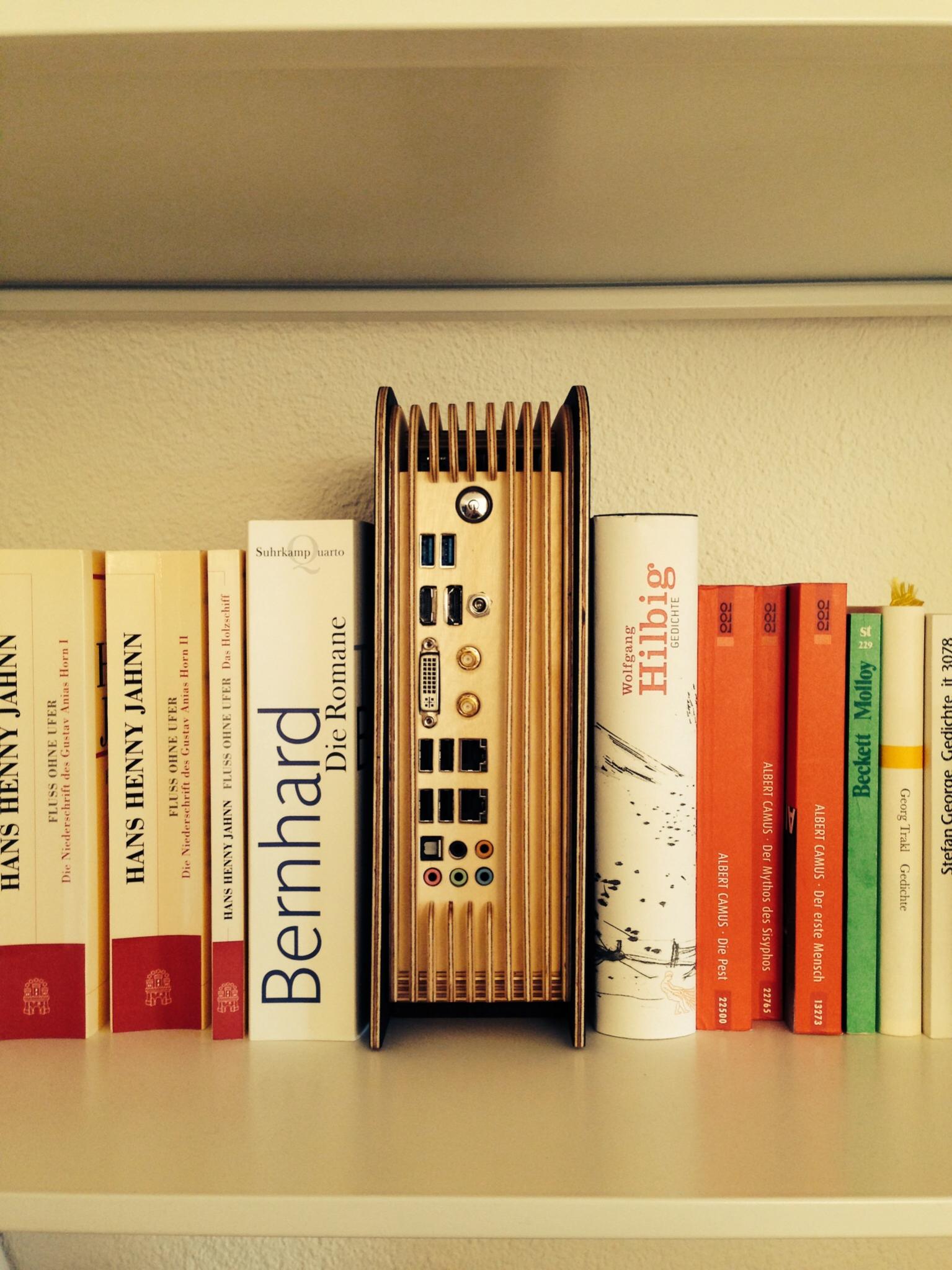 Ein schönes Gehäuse. Ich würde nur entweder die Anschlüsse auf die andere Seite verlegen, sodass man die Kabel am Buchrücken anschliesst und es so ins Regal stellen, wie man es im Bild aus Beitrag #4 sieht, oder den Buchrücken noch ein wenig aufwerten, z.B. mit einer Gravur und/oder einem schlicht illuminierten Taster - aber so ganz ohne alles, sieht er ein wenig verloren aus...