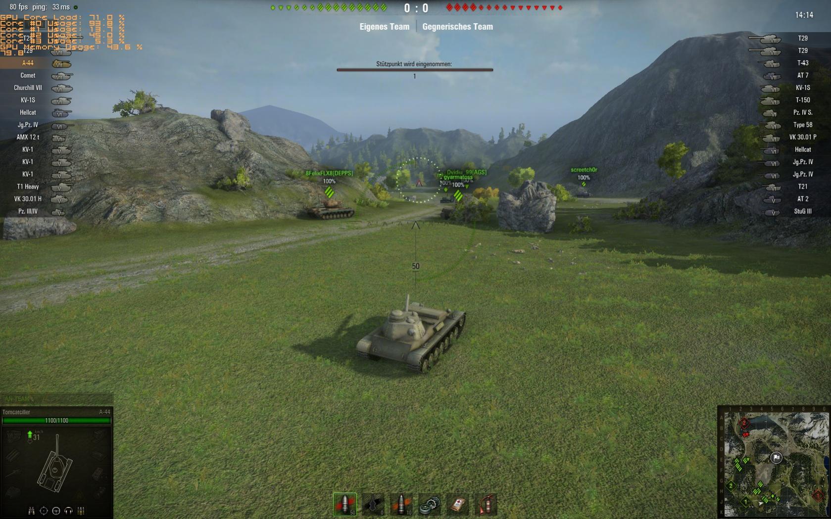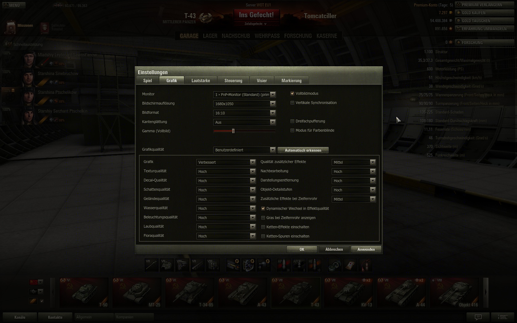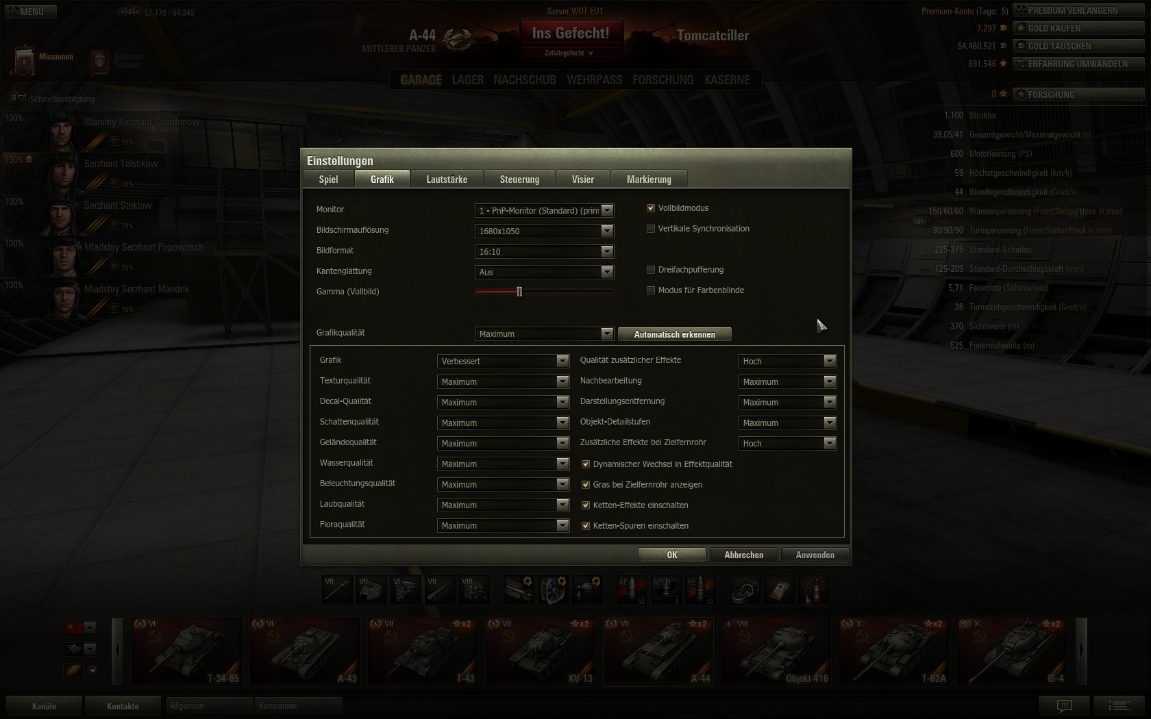Nun denn nach der Aufrüstung der Hardware in WoT reingegangen und Autodetect laufen lassen. Es wurde alles auf Maximum eingestellt. Auf AA und Dreifachpuffer habe ich verzichtet, ebenso vorerst auf Vsync.