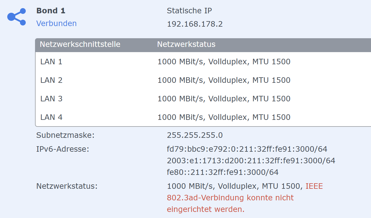 Ich würde gerne die Link Aggregation nutzen, jedoch will es nicht recht gelingen das einzurichten. Ich habe schon eine BOND eingerichtet und die 4 Kanäle somit gebündelt. Das führt allerdings dazu, dass ich folgende Fehlermeldung bekomme: