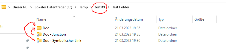 Hier mein Testordner. Je eine Junction und ein Symlink zeigen auf den "Doc" Ordner.