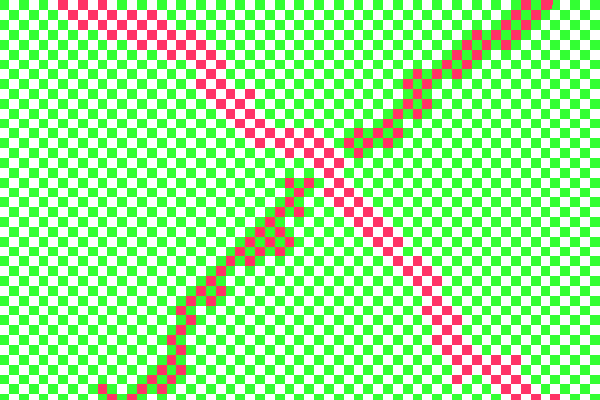 In meinem Bild sehe ich (nicht rangezoomt) 4 Farbtöne, Grün, Weiß, so eine Art lila (von links oben nach rechts unten) und ein stärkeres Rot (von rechts oben nach links unten).