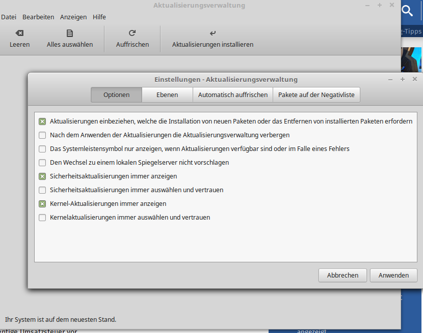 Könntet ihr mir da vielleicht weiterhelfen, wie ich das einstellen kann, dass nur Ebene 1 und 2 Updates installiert werden und keine Kernel Updates?