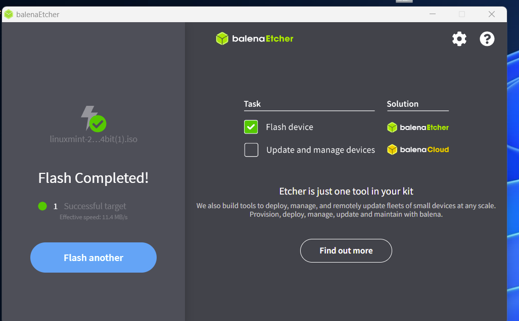 Ich habe mit "Balena Etcher" den Linux Stick erstellt.