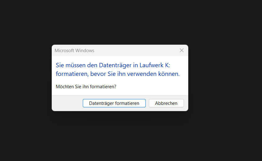 Kurz vor Abschluß soll ich den Stick formatieren, habe ich abgebrochen, also nicht formatieren gedrückt.