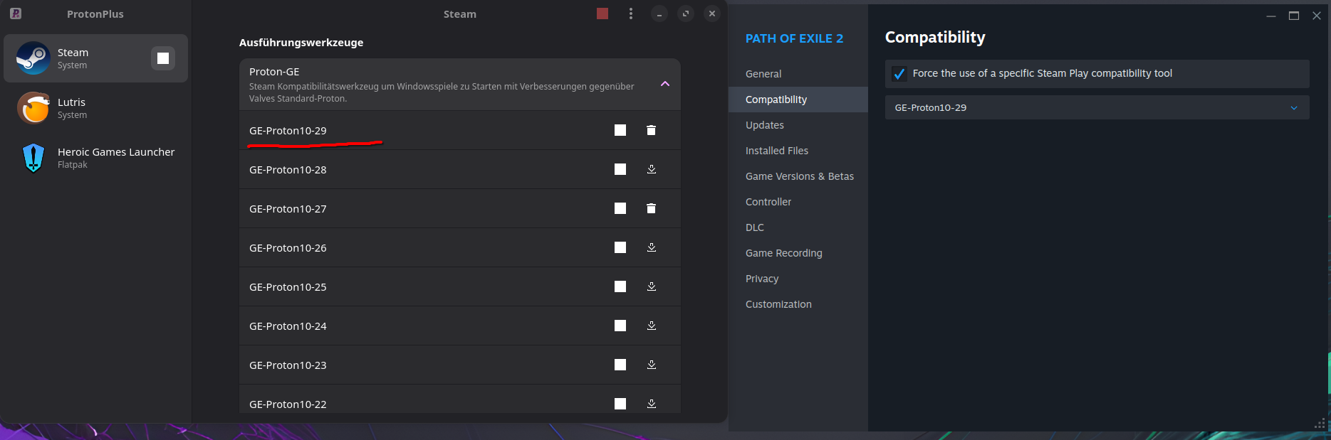 - Aktivieren Sie "Die Verwendung eines bestimmten Kompatibilitäts-Tools für Path of Exile 2 erzwingen" und wählen Sie GE-Proton 10-x oder neuer.