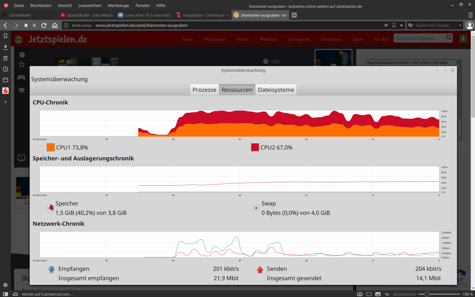 Heute habe ich mal die Live Version von Mint 19.2 ausprobiert, aber da war ein ähnliches Ergebnis zu beobachten - auch meine alte Geforce 660 hat nichts an der Situation geändert (Hardwarebeschleunigung).