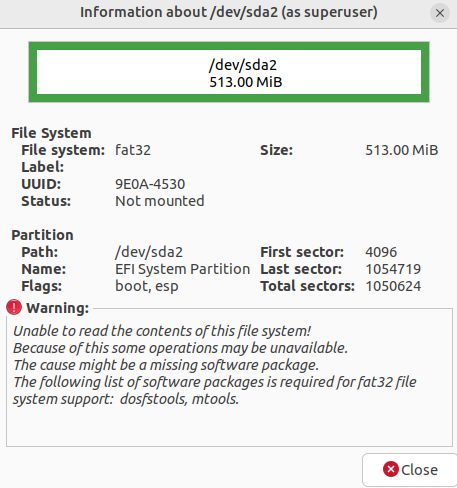 /dev/sda2 4096 1054719 1050624 513M EFI System