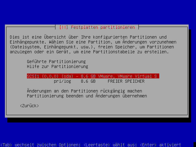 Hier werden die Datenträger angezeigt. Man wählt die für die Installation in Frage kommende Hard-disc aus.