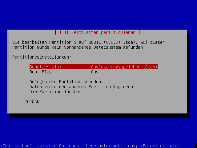 Die Partitionsgröße wird angegeben. Die Größe der Swap-Partition sollte zweimal die Größe des Arbeitsspeichers haben.