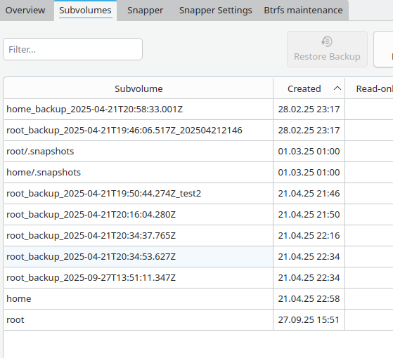 Allerdings hatte ich mich mit btrfs-Assistant bisher nur sehr grob beschäftigt. Ich hatte gemerkt, dass ich root und home wieder herstellen kann und das hatte mir erstmal gereicht. Viel mehr weiß und kann ich bisher auch nicht.