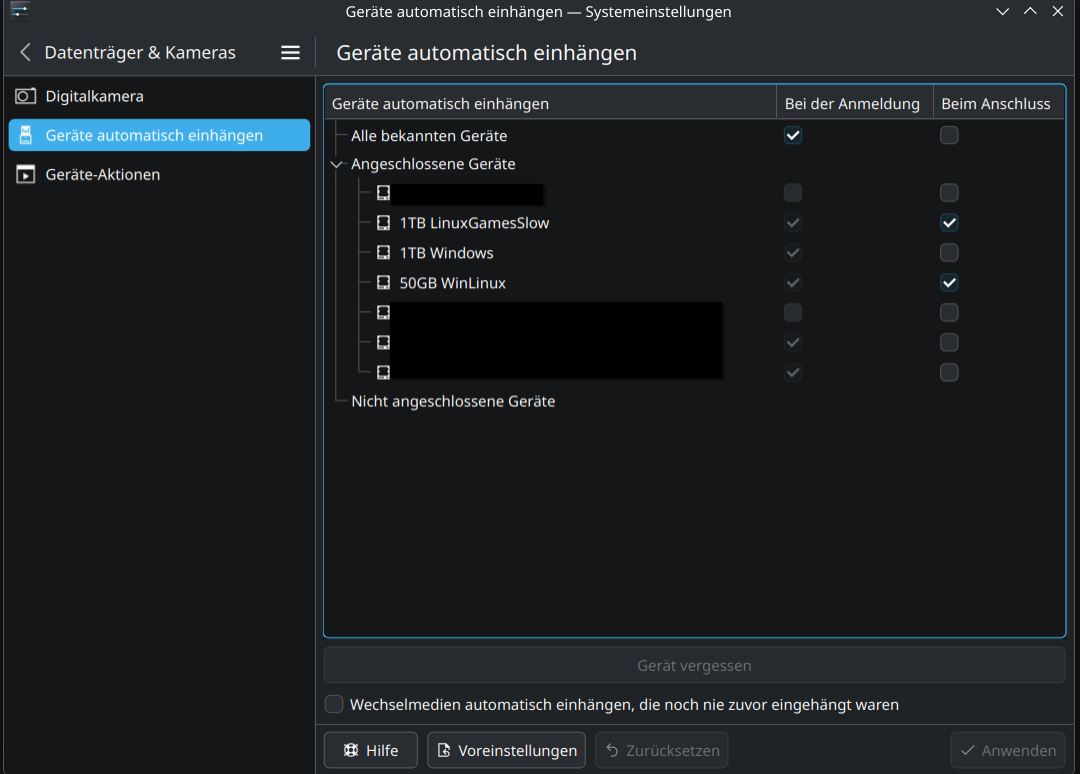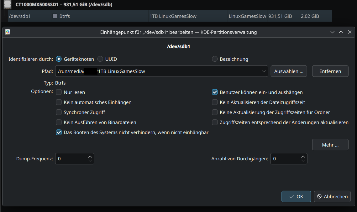 Eigentlich sollte die Einträge in fstab auch mit der KDE-Partitionsverwaltung funktionieren, aber das war mir immer zu undurchsichtig. Vielleicht bediene ich es falsch, oder es ist buggy.