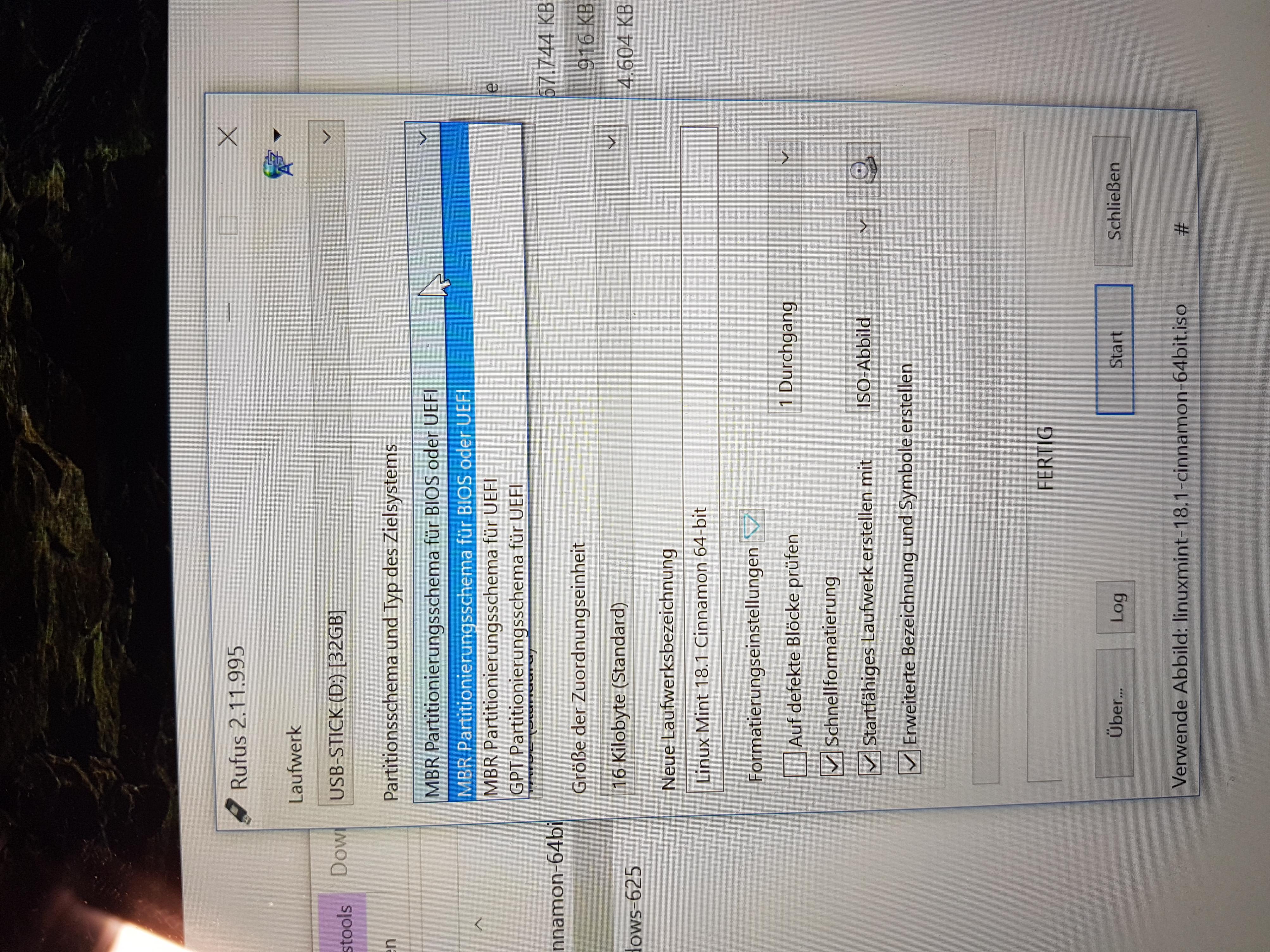Anmerkung: Auch zum Erstellen des Linux-Sticks würde ich keinesfalls Rufus einsetzen, sondern eben Unetbootin, wo auch keine extra Einstellungen vorzunehmen wären. Generell merzt Du auf diese Weise Fehlerquellen aufgrund unbewussten Falscheingaben weitesgehend aus.